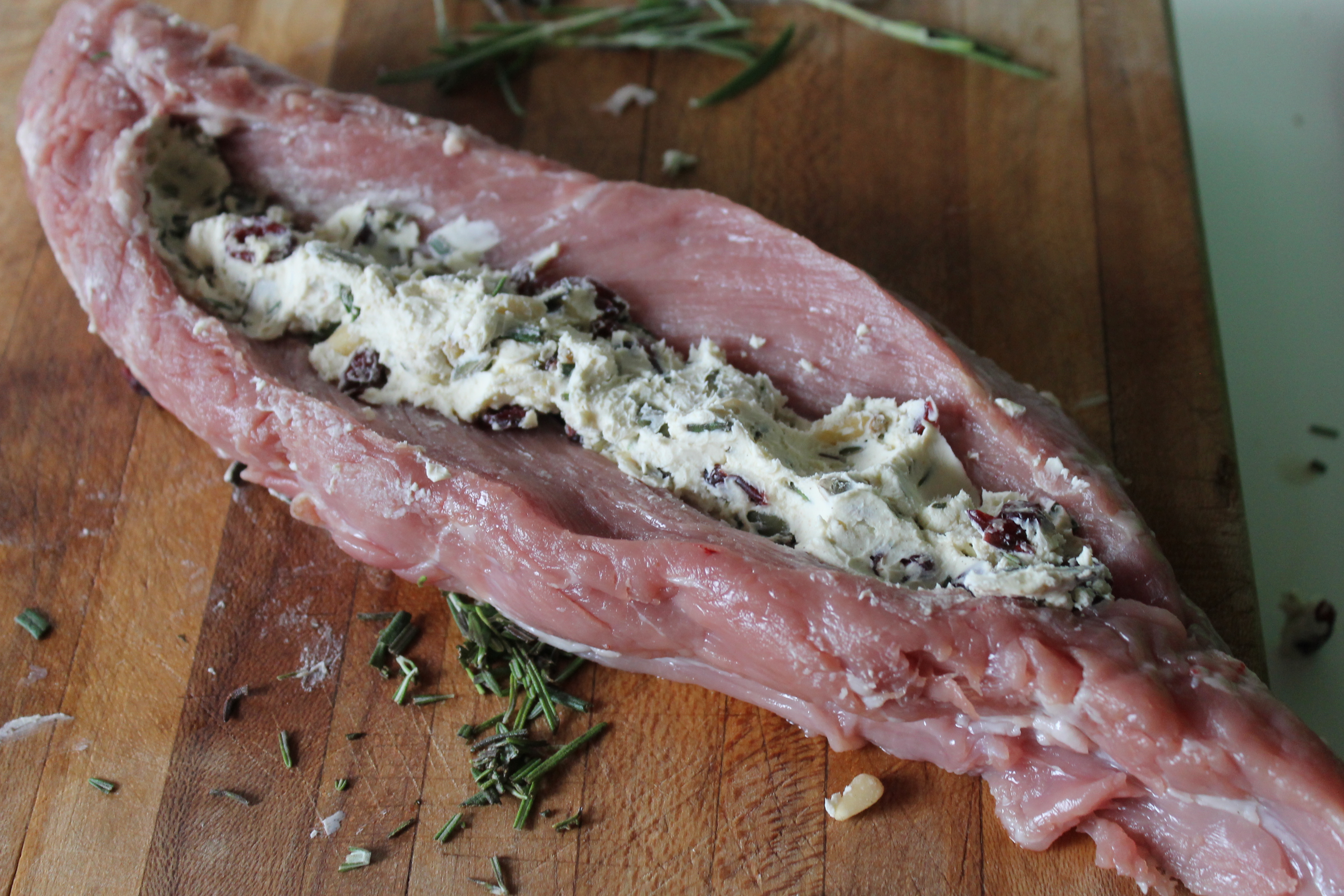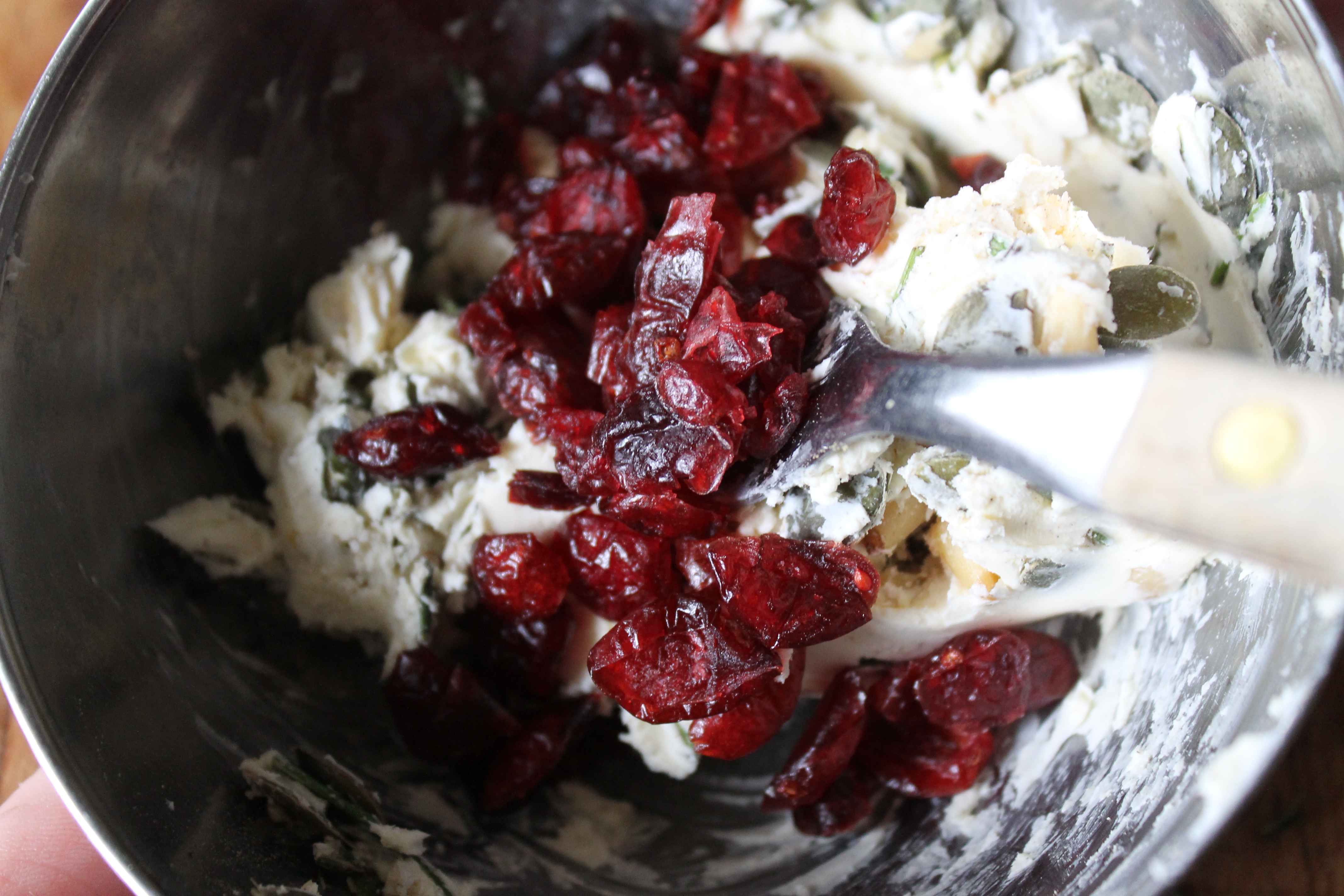 Hrærði saman svona 100 g af rjómaosti, 1 tsk af söxðu rósmaríni (saxaði heldur meira til að strá utan á), 1 msk af furuhnetum, 1 msk af graskersfræjum, 1 msk af þurrkuðum trönuberjum (af því að ég átti þau til) og kryddaði með pipar og salti.