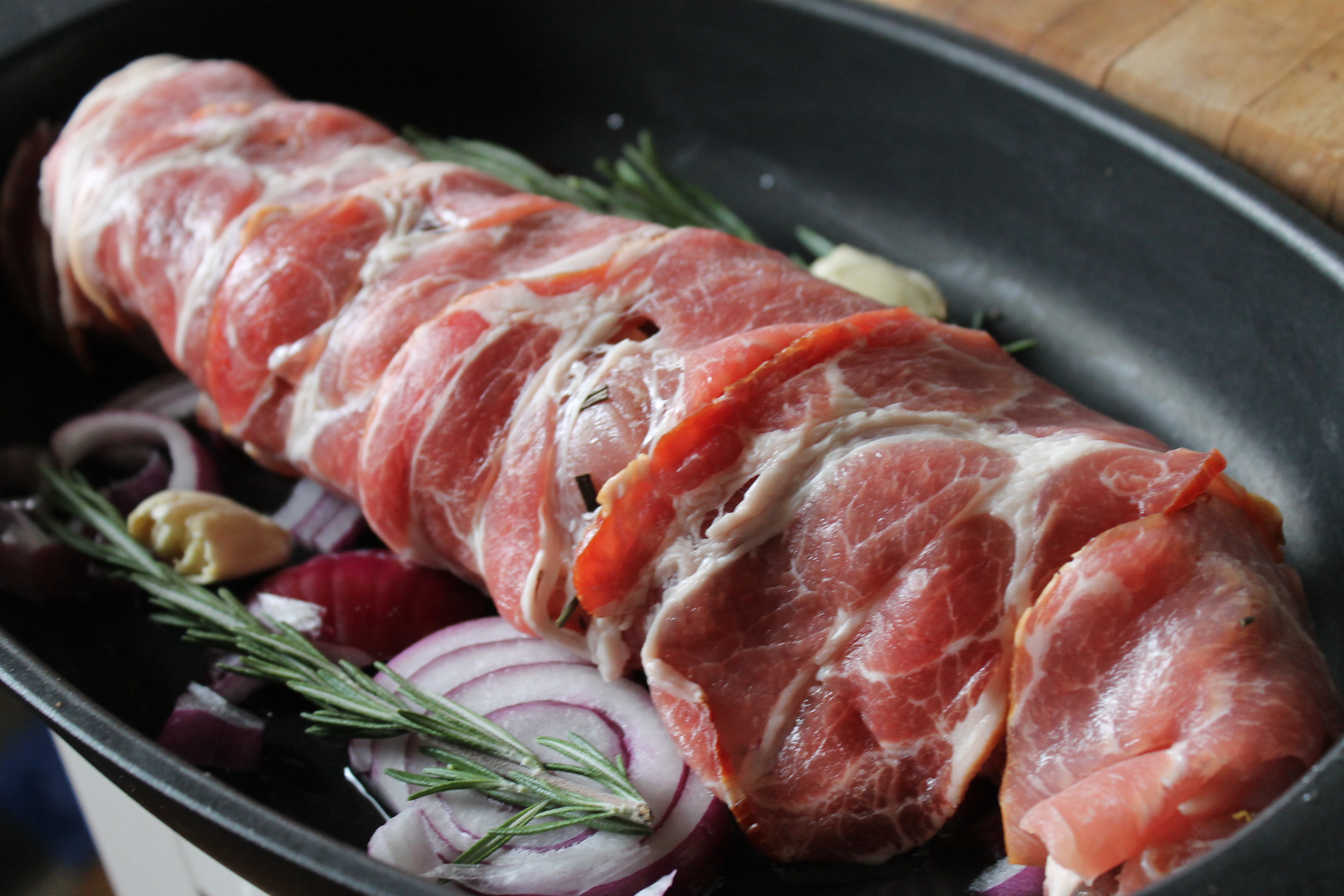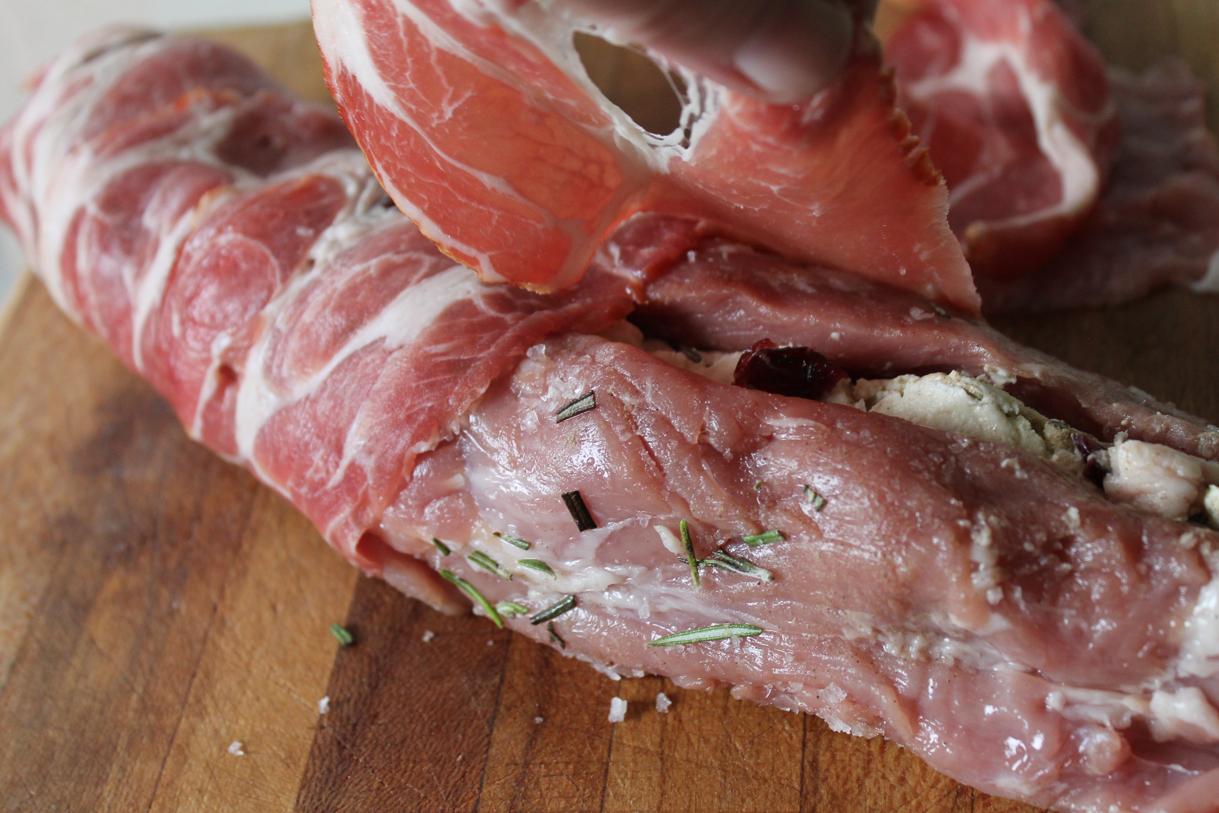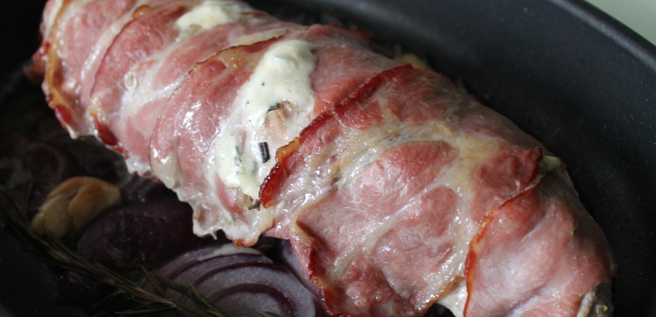 Síðan vafði ég beikonsneiðum utan um. Eða af því að þetta var lúxusbeikon, þá lagði ég þær reyndar bara yfir og stakk endunum inn undir kjötið.