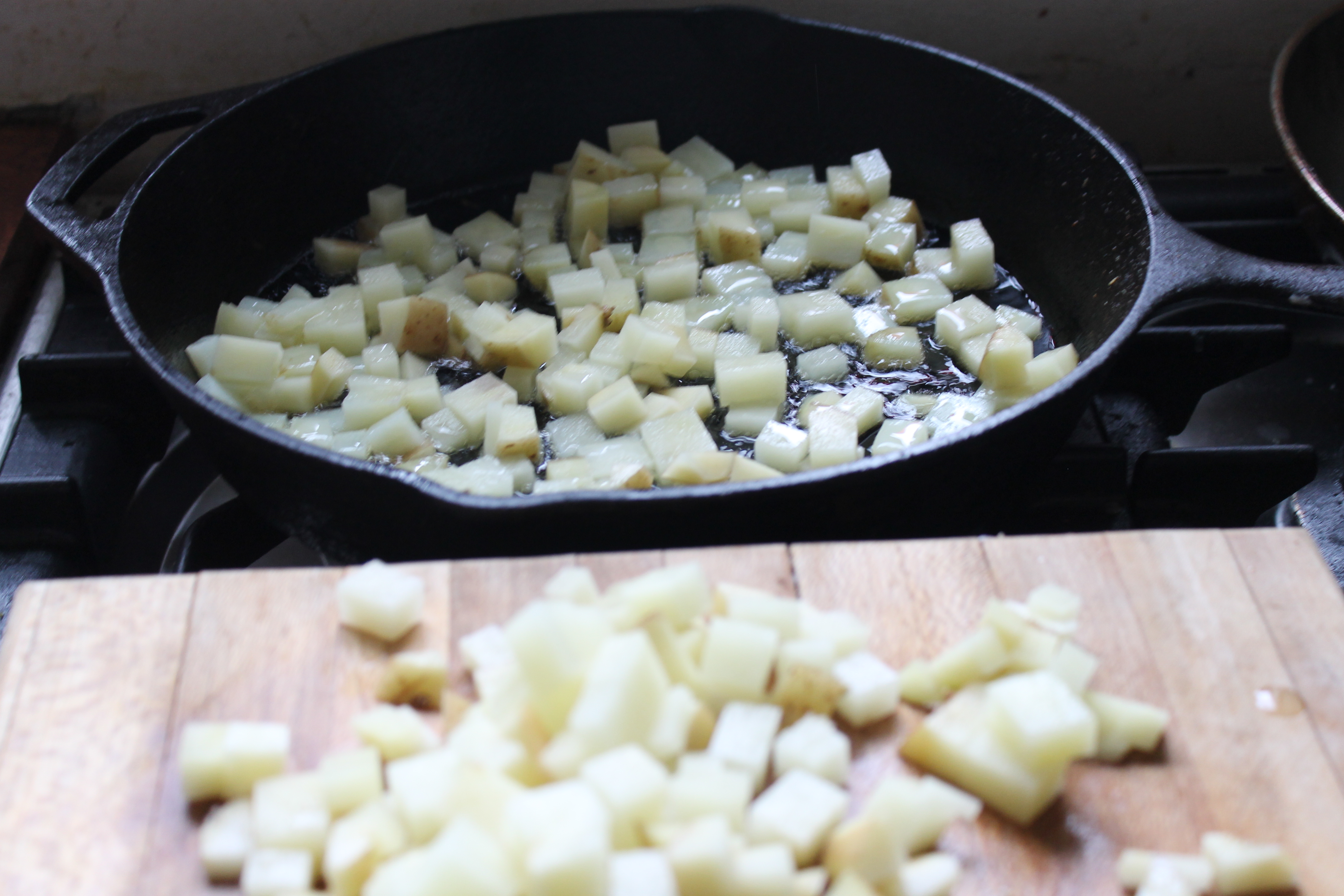 Á meðan steikti ég kartöfluteninga. Skar tvær stórar kartöflur í teninga, kannski tæpan sentímetra á kant. Hitaði slatta af olíu á stórri pönnu og steikti kartöflurnar við góðan hita (best að setja þær ekki allar í einu á pönnuna, heldur lófafylli eða svo í einu og láta líða svona mínútu á milli svo hitinn detti ekki of mikið niður). Ég kryddaði með pipar, Maldonsalti og þurrkuðu timjani. Það er best að hræra oft í kartöflunum.