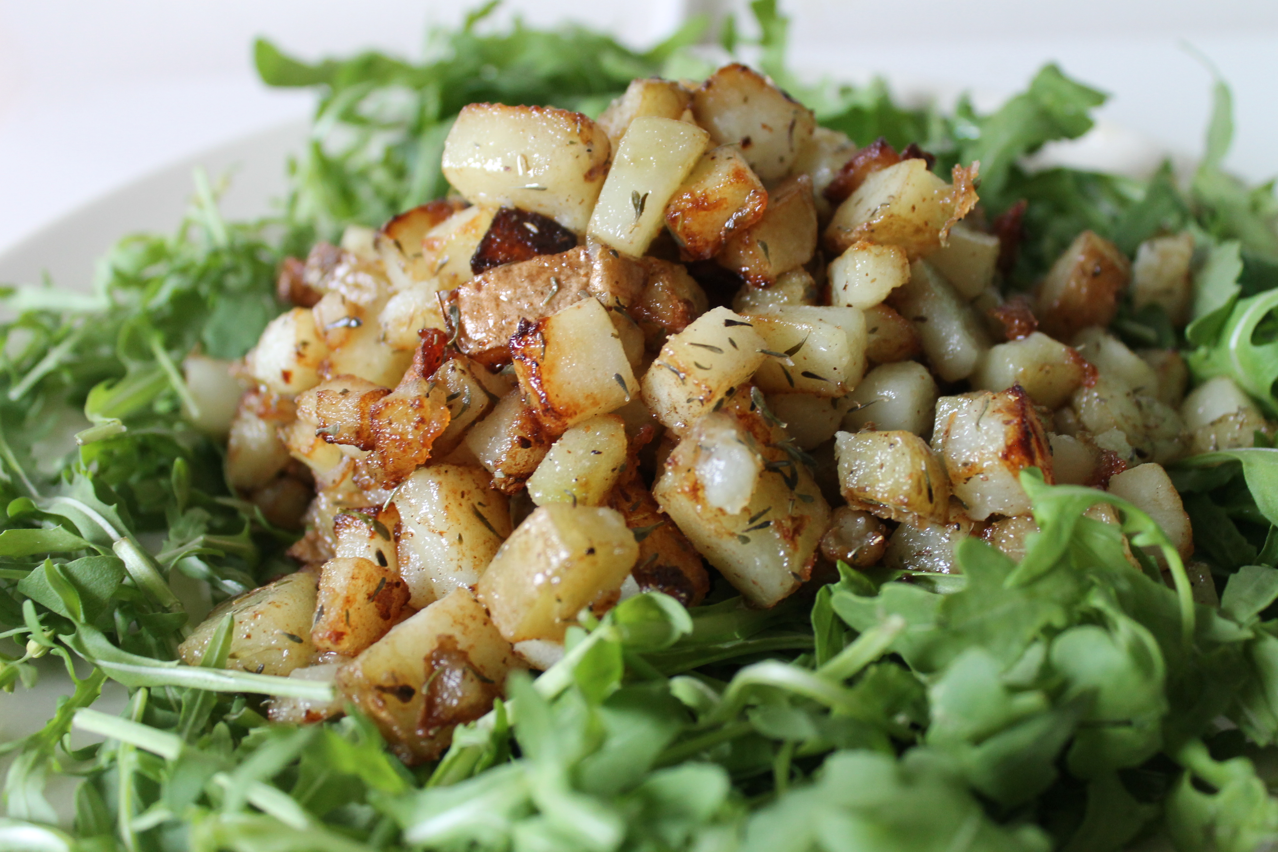 Ég steikti þær í svona 10-12 mínútur, eða þar til þær voru meyrar og fallega brúnar, dreifði klettasalati á disk og setti kartöflurnar í miðjuna.