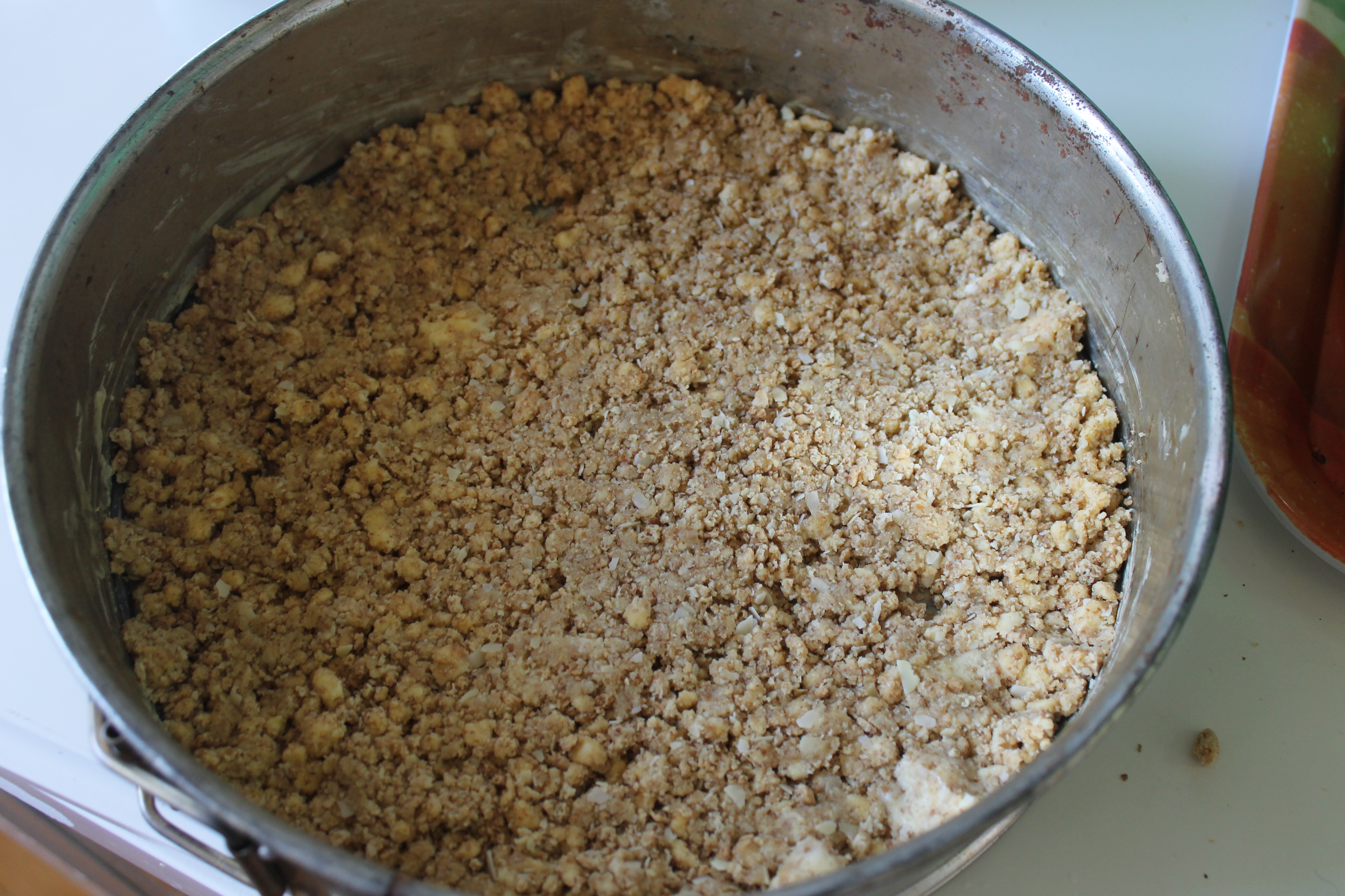 Ég stillti ofninn á 175°C og fór að gera botninn. Hann er sirka 150 g af heilhveitikexi (ég er alltaf að tönnlast á því að Haust-kex er ekki hafrakex, það eru nákvæmlega engir hafrar í því, en það hefur verið tilgangslítið hingað til) og 25 g af möndluflögum (má líka sleppa þeim) sem er sett í matvinnsluvél ásamt 80 g af smjöri og vélin látin ganga þar til þetta er orðið að grófri mylsnu. Það mega alveg vera litlir smjörbitar í, gerir ekkert til.