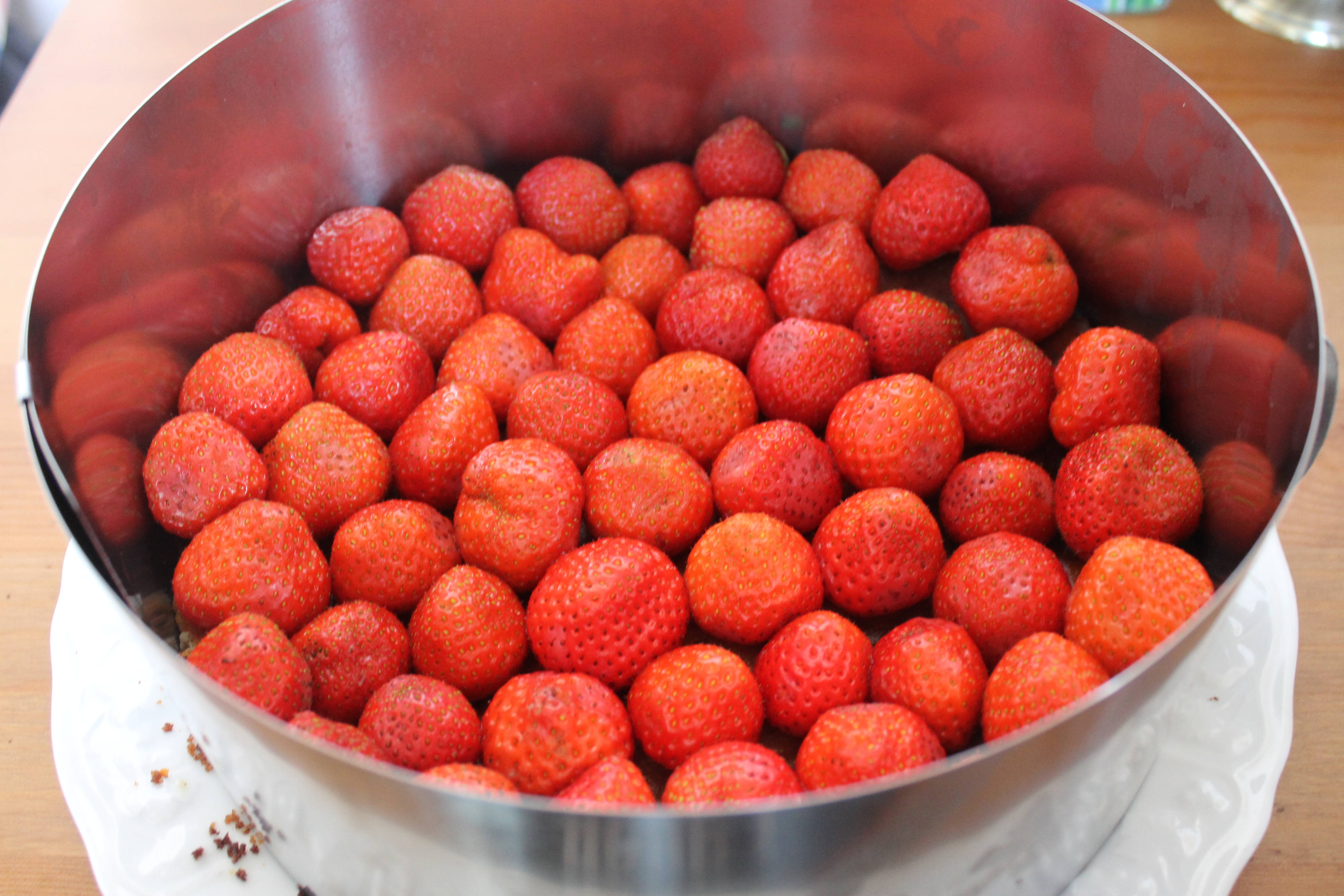 Raðaði þýsku jarðarberjunum þétt inn í hringinn. Ég nota mjög gjarna svona hring þegar ég set eitthvað á tertur – hann er stillanlegur og hægt að þrýsta honum vel upp að botninum og láta hann halda utan um. Ekkert nauðsynlegur þarna svosem en mjög hentugur þegar maður er t.d. að setja frómas eða eitthvað slíkt á tertur. Og mjög hentugur þegar þarf að flytja kökur milli húsa, ég tala nú ekki um í strætó … En ég notaði hann aðallega til að hjálpa mér að raða jarðarberjunum.