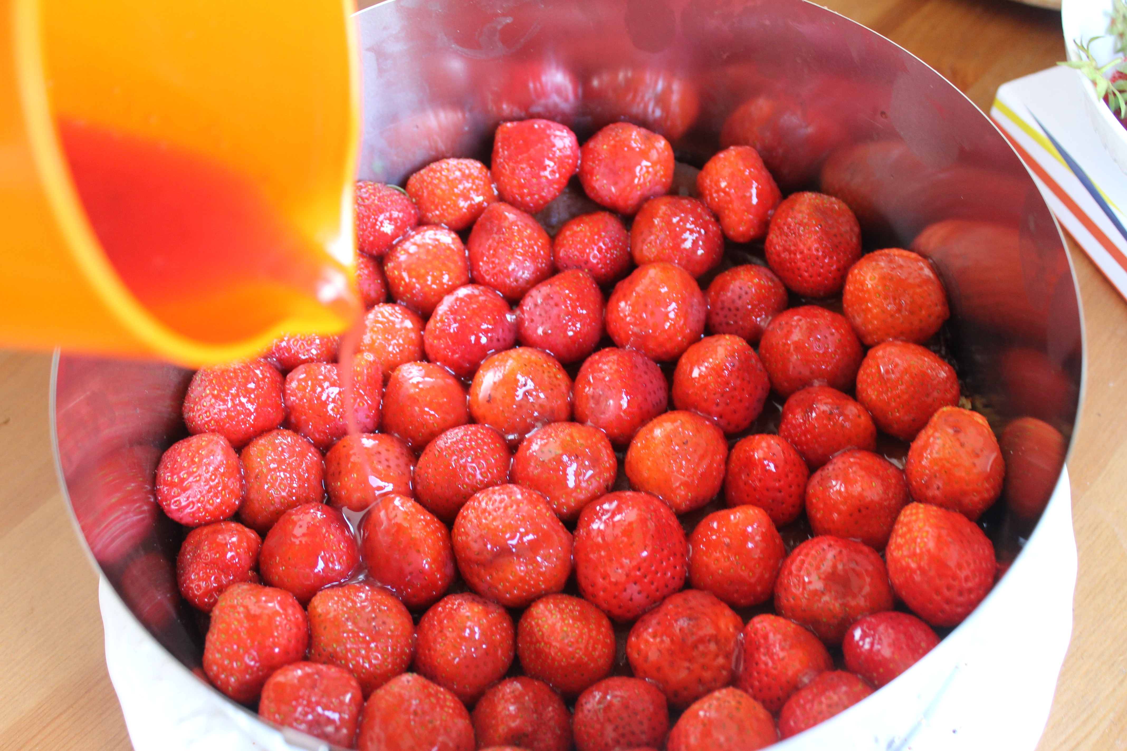 Svo hitaði ég jarðarberjasafann aftur í potti með 2-3 matskeiðum af góðri jarðarberjasultu og bræddi 1/2 matarlímsblað í blöndunni. Hellti þessu jafnt yfir öll berin og reyndi að láta löginn þekja þau. Þetta er bæði til að festa berin og gefa þeim gljáa.