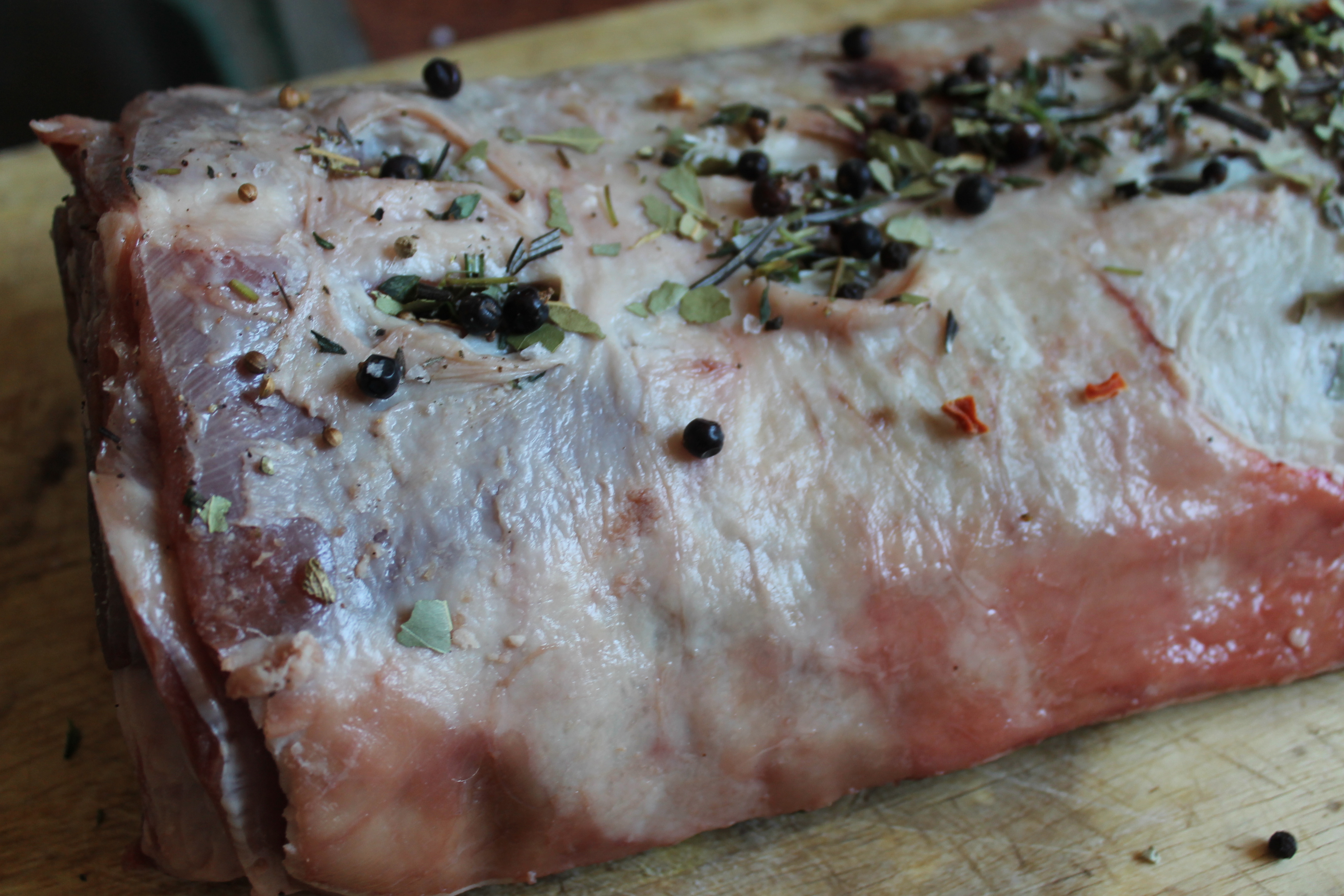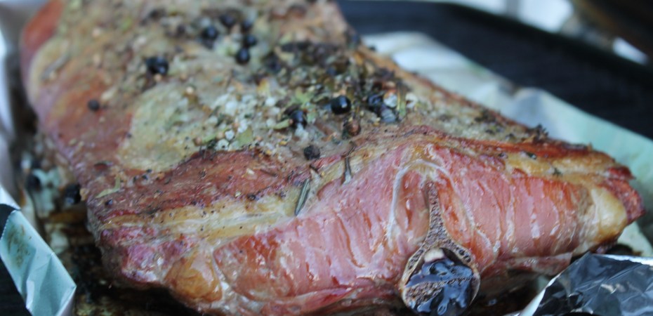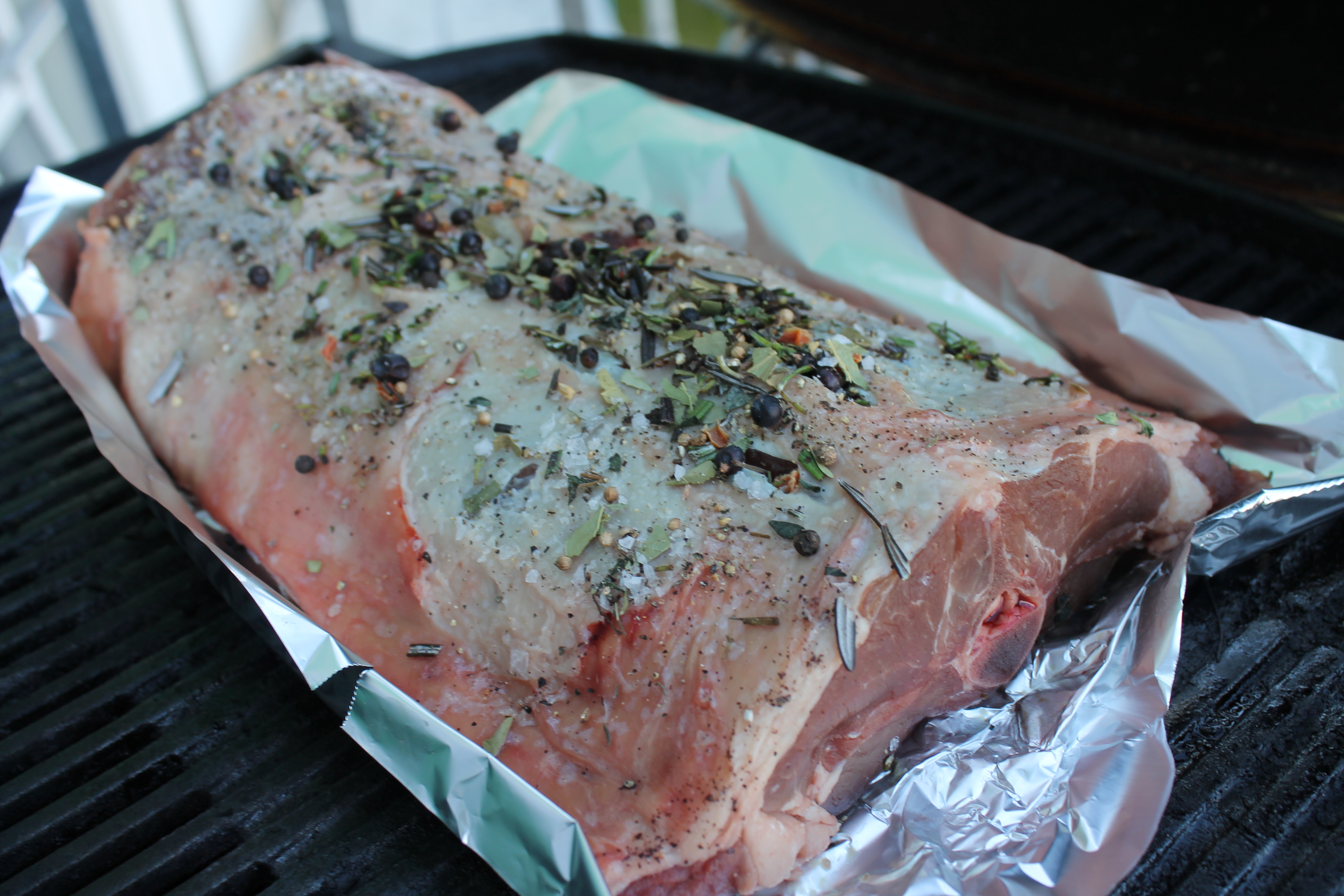 Ég tók hrygginn úr kæli klukkutíma áður en hann fór á grillið. Saxaði rósmarín og timjan og blandaði saman við nýmalaðan pipar og maldonsalt og kryddaði hrygginn neðanverðan, sneri honum svo við, skar nokkrar raufar í hann alveg upp við hryggbeinið báðum megin, og bætti villibráðarkryddblöndu (einiber, lárviðarlauf, kóríanderfræ og eitthvað fleira) við rósmarínblönduna og kryddaði hrygginn að ofan; setti dálítið af kryddinu í raufarnar. Lét svo hrygginn standa nokkra stund.