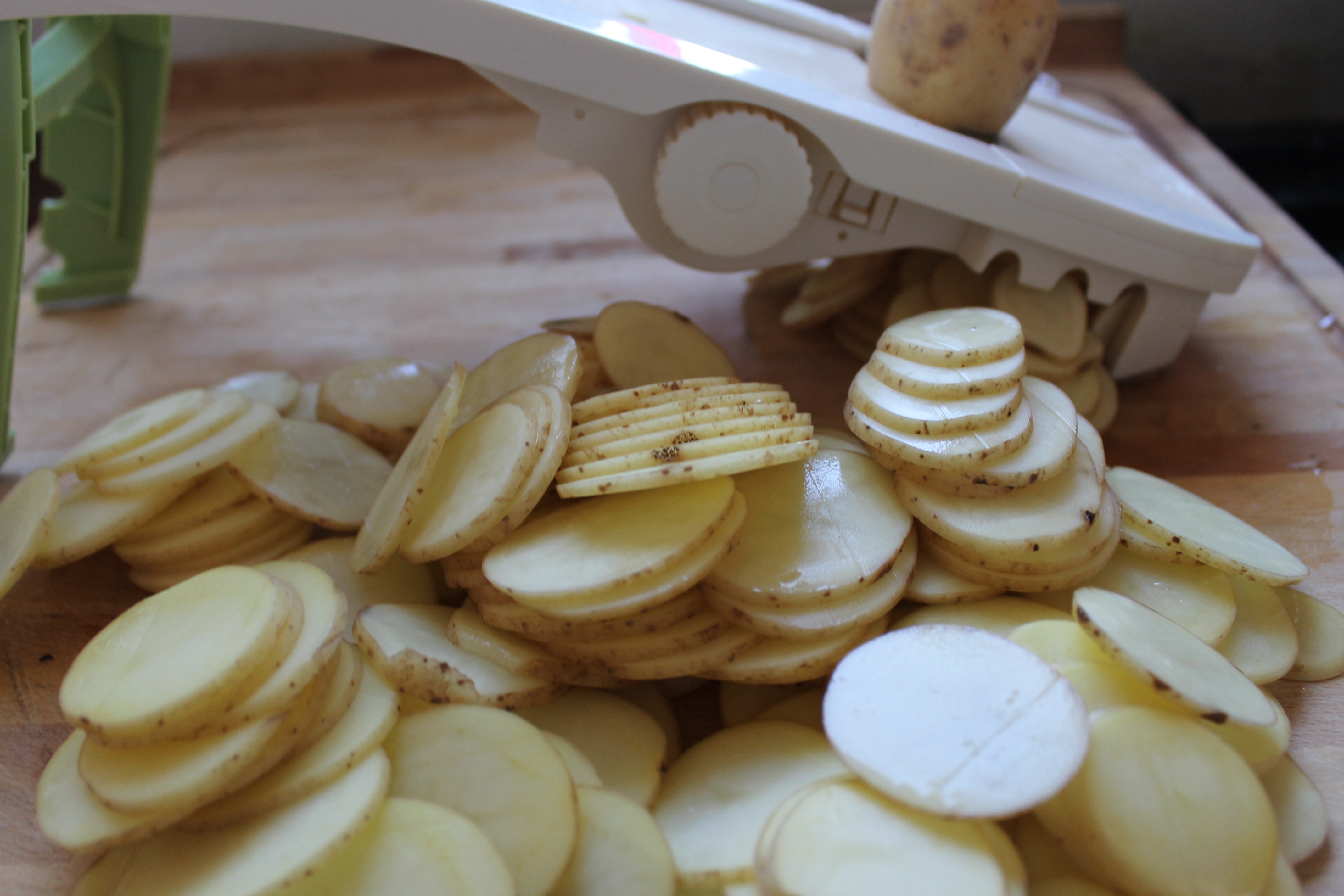 Ég ákvað að hafa kartöflugratín með. Ég á mandólín sem ég nota nú ekki oft en það er eiginlega ómissandi þegar maður þarf að skera mikið magn af kartöflum í þunnar sneiðar. Ætli þetta hafi ekki verið svona 1,2 kíló?