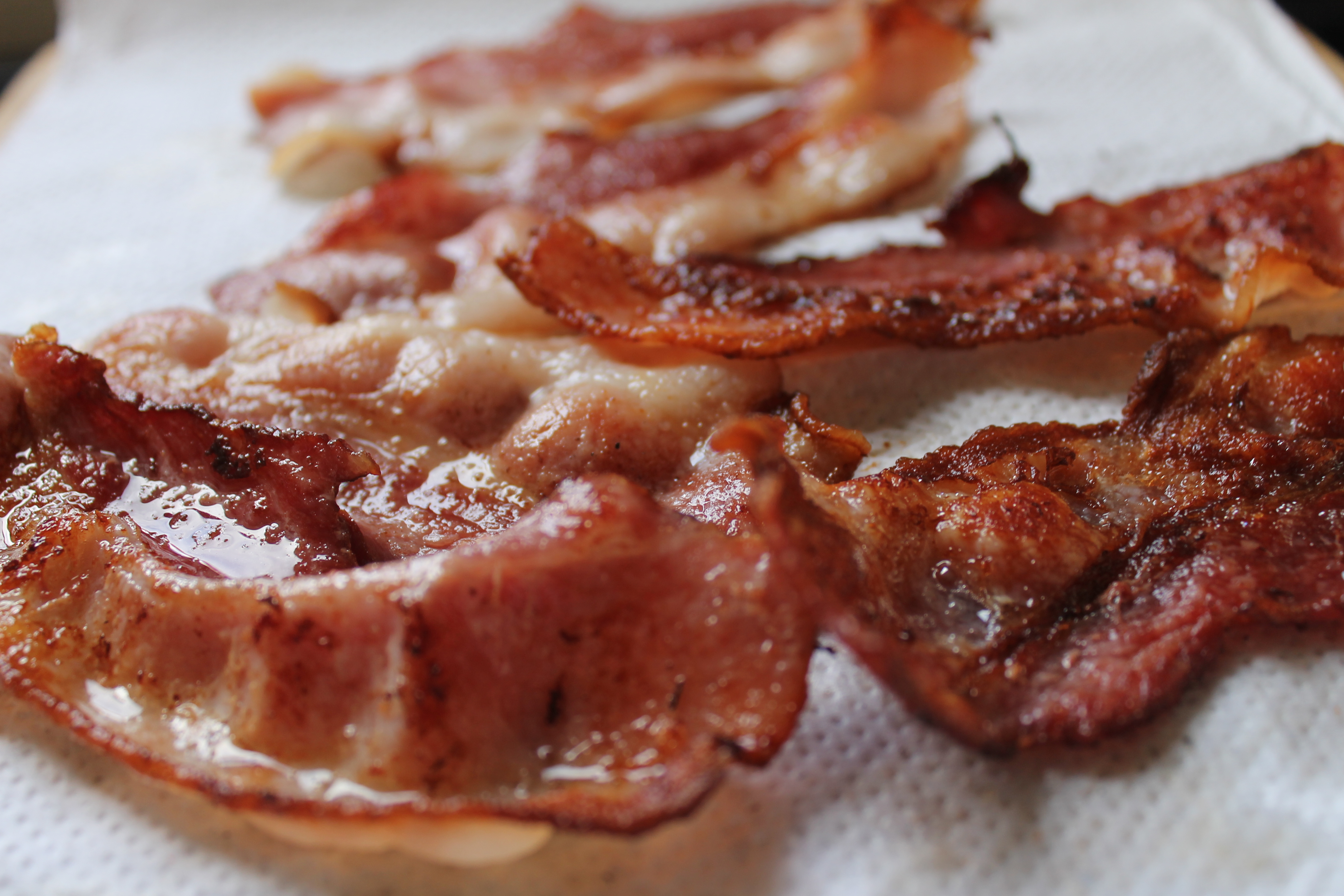 Þá raðaði ég þeim á eldhúsrúllublað, lagði annað blað ofan á og setti farg ofan á það og lét standa nokkra stund. Þetta er til að pressa sem mest af fitunni úr beikoninu.