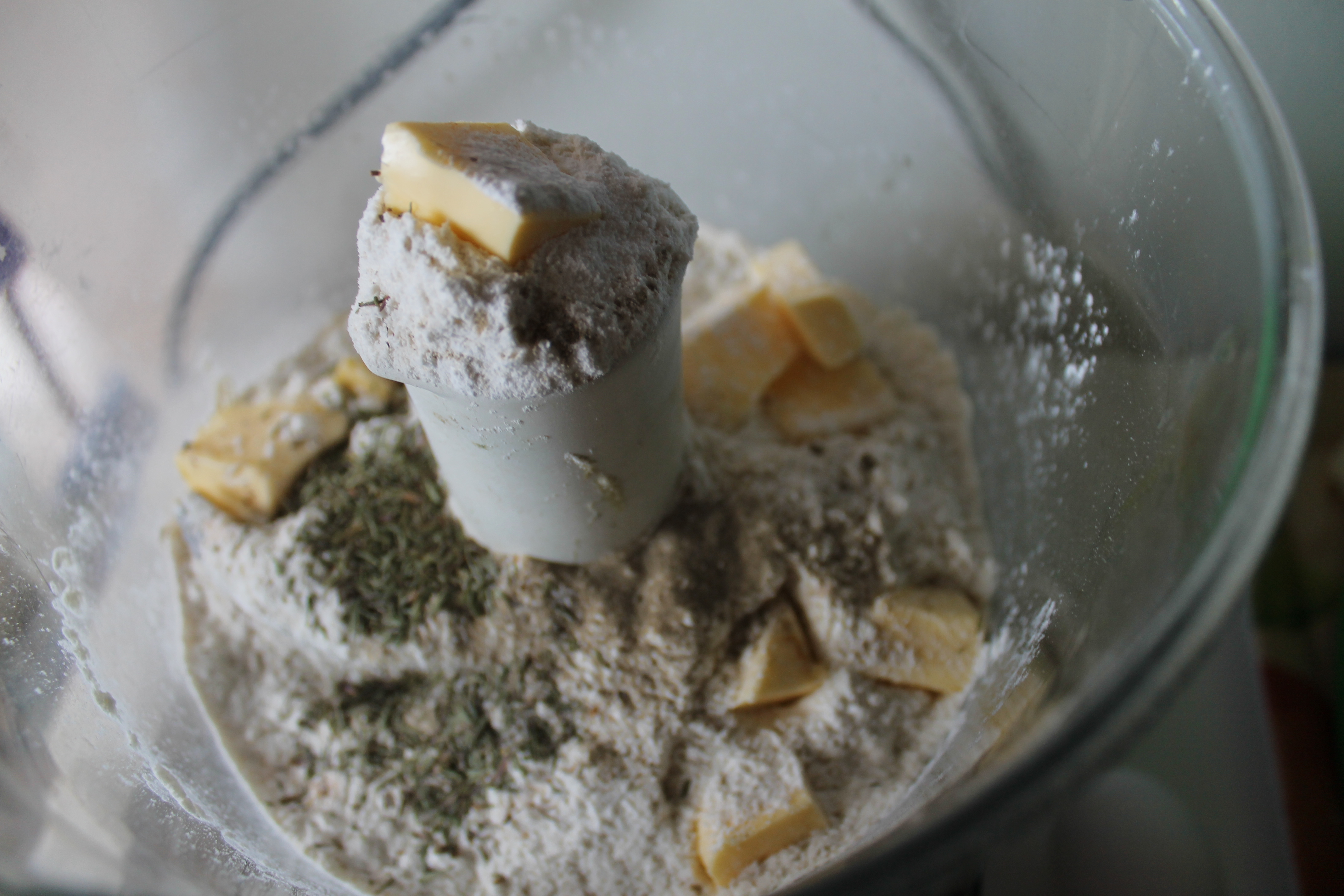 Á meðan tók ég fram matvinnsluvélina, setti í hana 100 g af hveiti, 40 g af köldu smjöri í bitum, 1/2 tsk af lyftidufti, 3/4 tsk af þurrkuðu timjani, slatta af pipar og ögn af salti (muna að beikonið er salt). Setti vélina af stað og lét hana ganga þar til þetta var orðið að mylsnu.