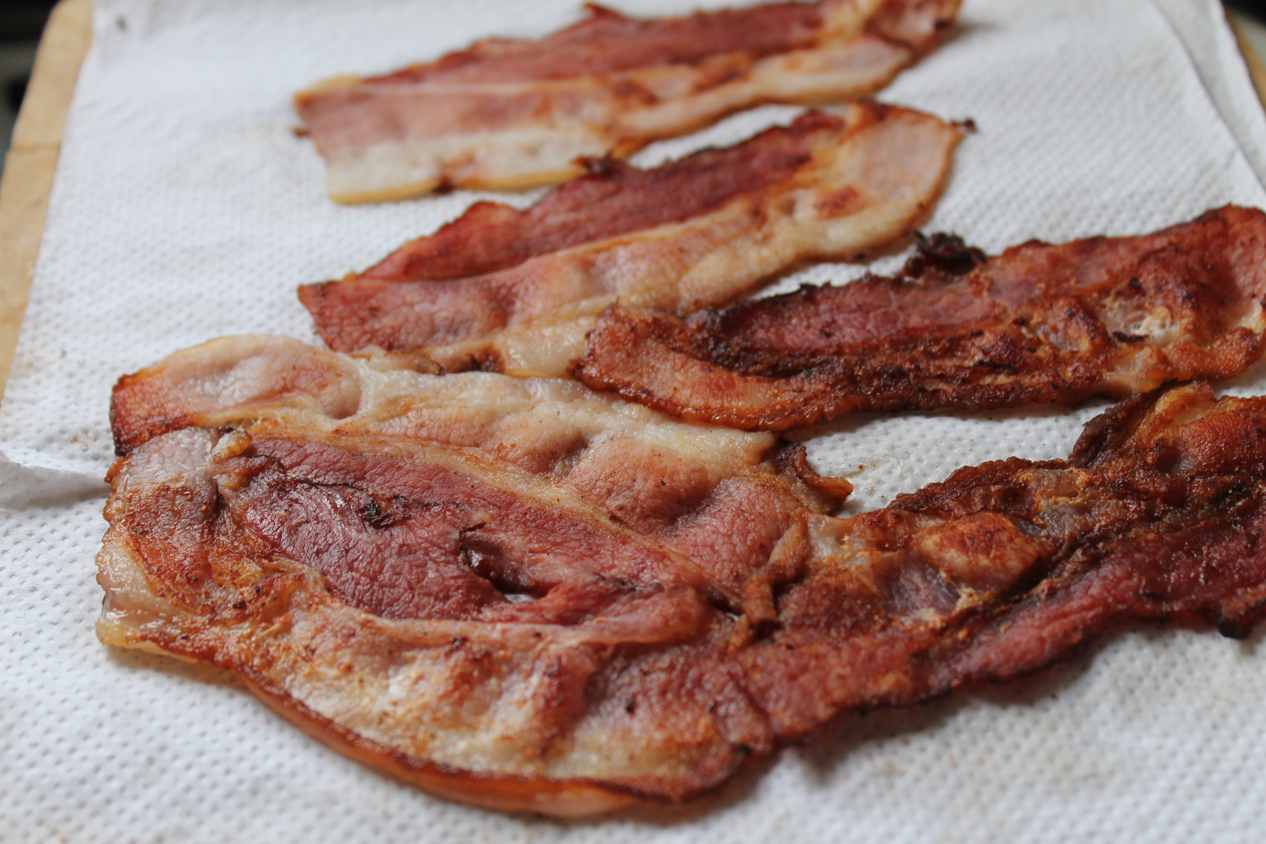 Byrjaði á að setja nokkrar beikonsneiðar (svona 130 g) á þurra, þykkbotna pönnu og steikja þær þangað til þær voru orðnar brúnar á báðum hliðum og stökkar.