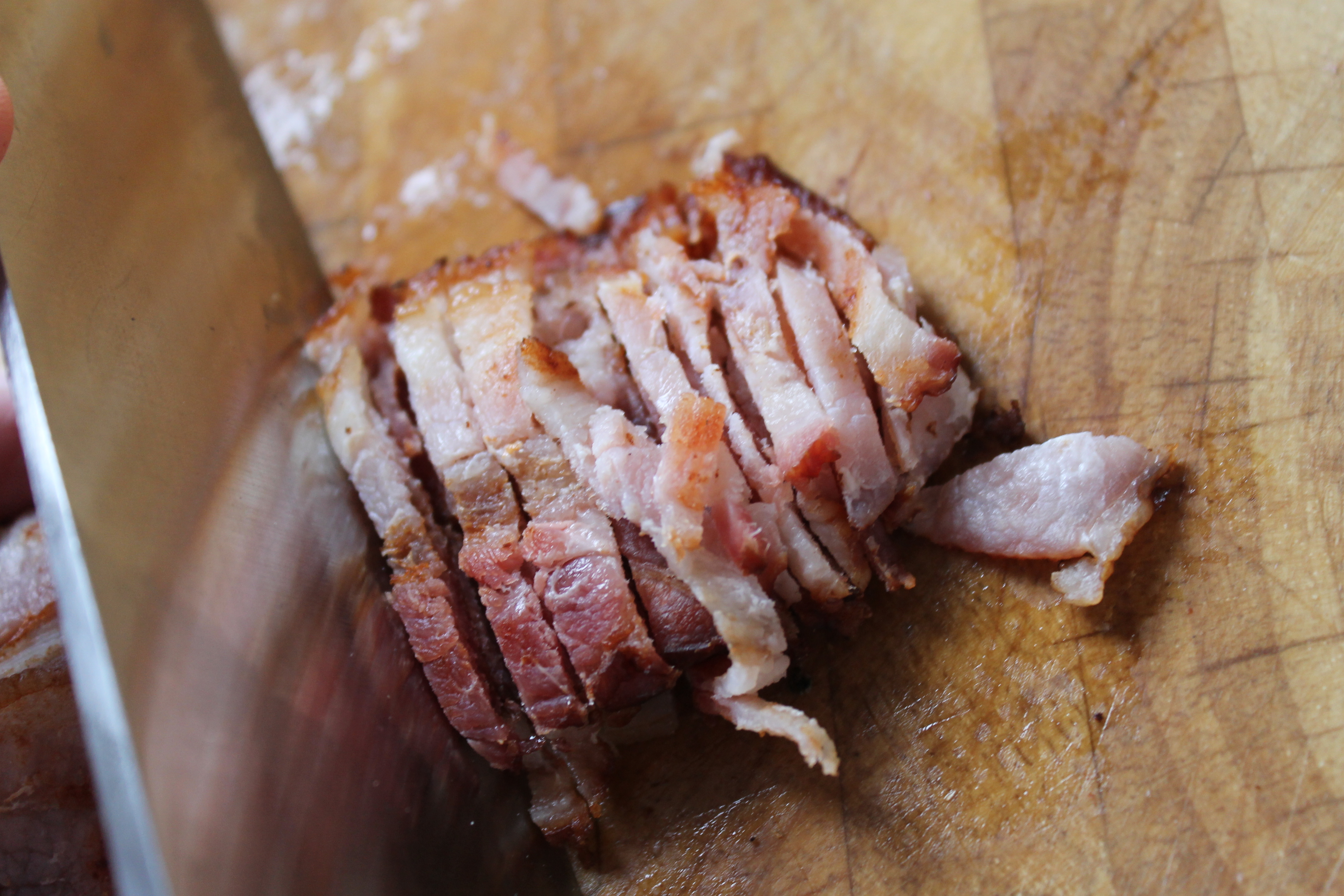 Svo staflaði ég beikonsneiðunum upp og saxaði þær, og tók lófafylli af basilíku og saxaði hana líka. Það má nota aðrar ferskar kryddjurtir í staðinn, eða þá þurrkaðar.