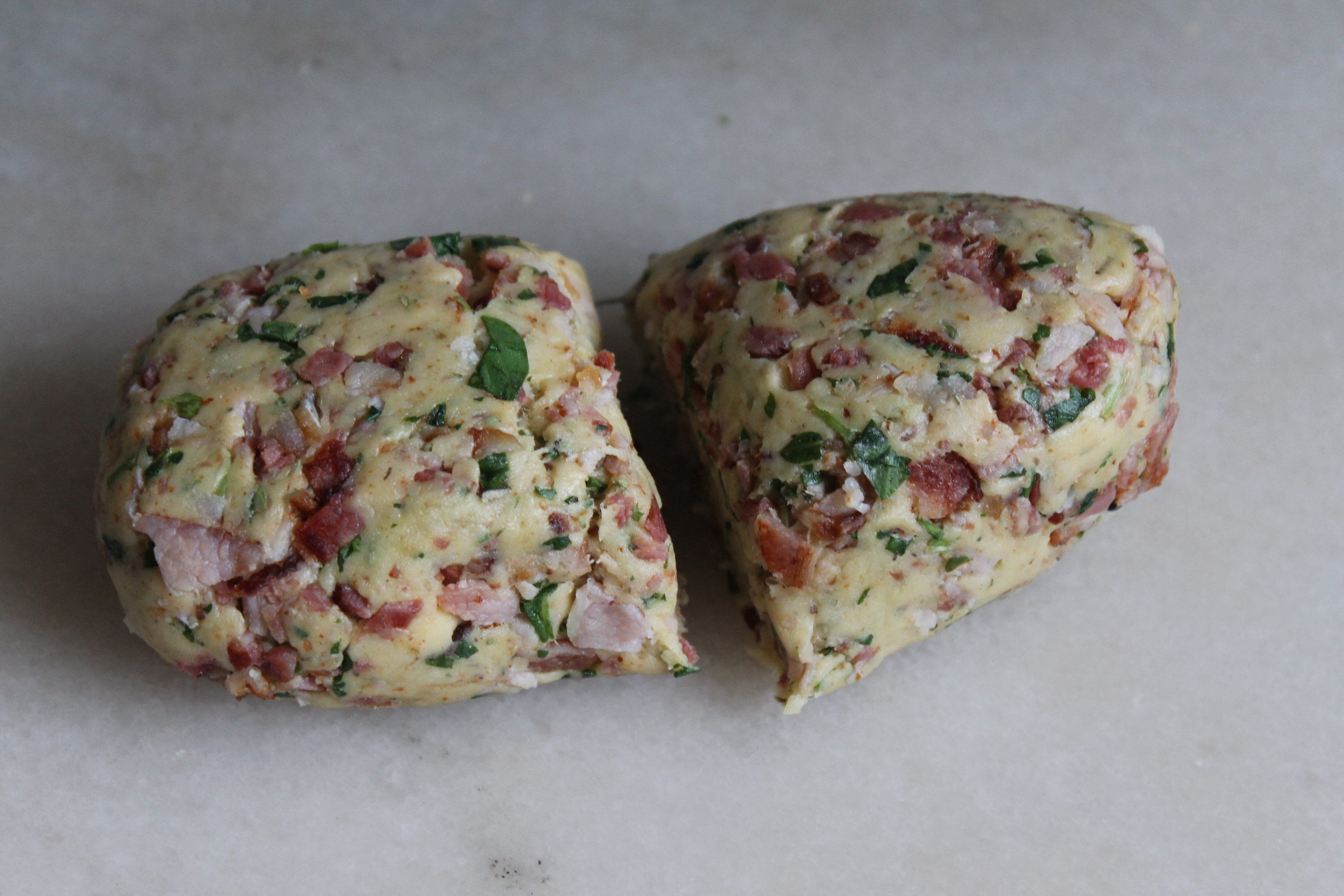 Blandaði beikoni go basilíku saman við deigið. Ég gerði það í matvinnsluvélinni og notaði púlshnappinn til að þetta saxaðist ekki of smátt en það má líka hnoða það saman við í höndunum. Svo skipti ég deiginu í tvennt því ég ætlaði að gera stórar flatkökur; það má líka hafa þær minni.