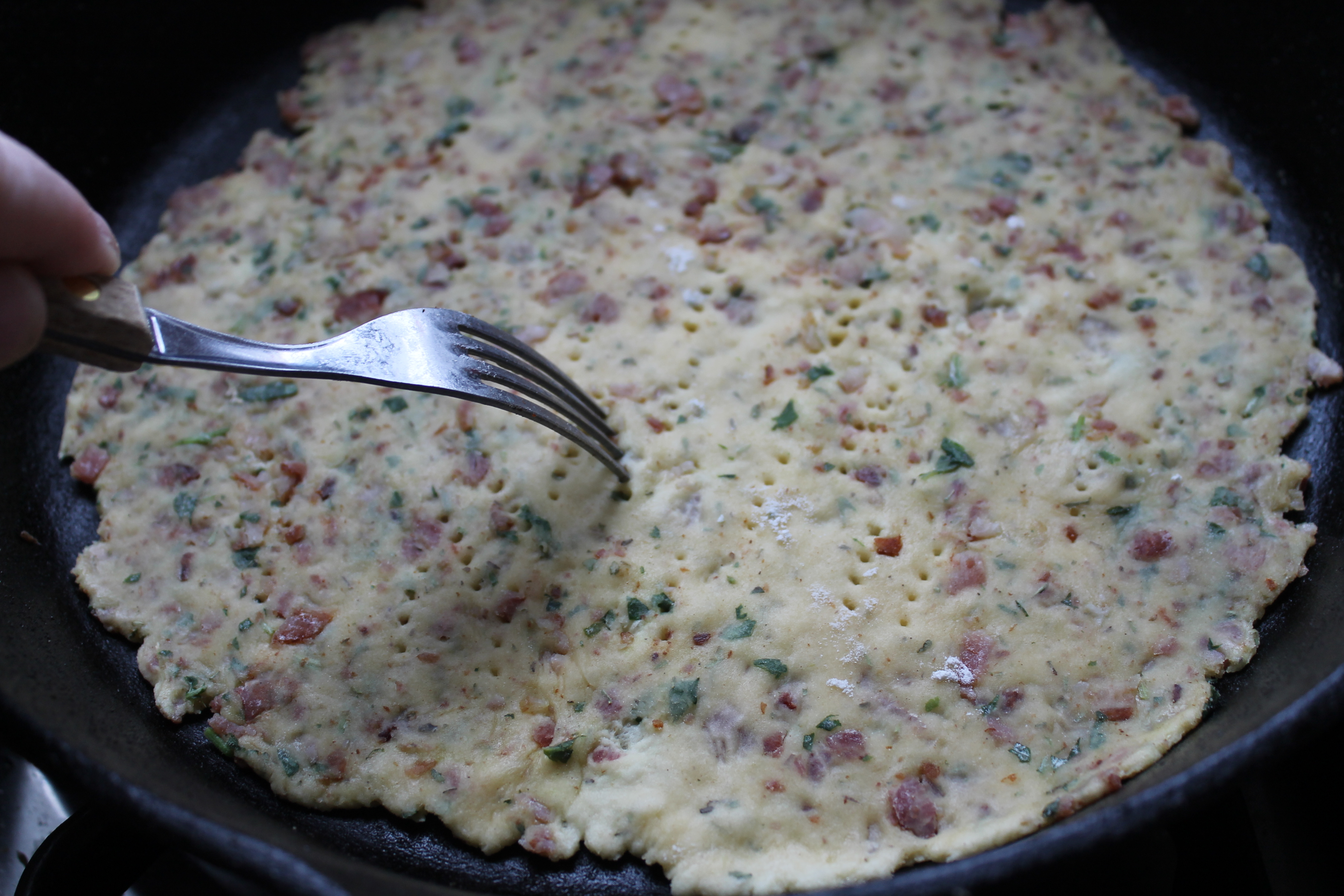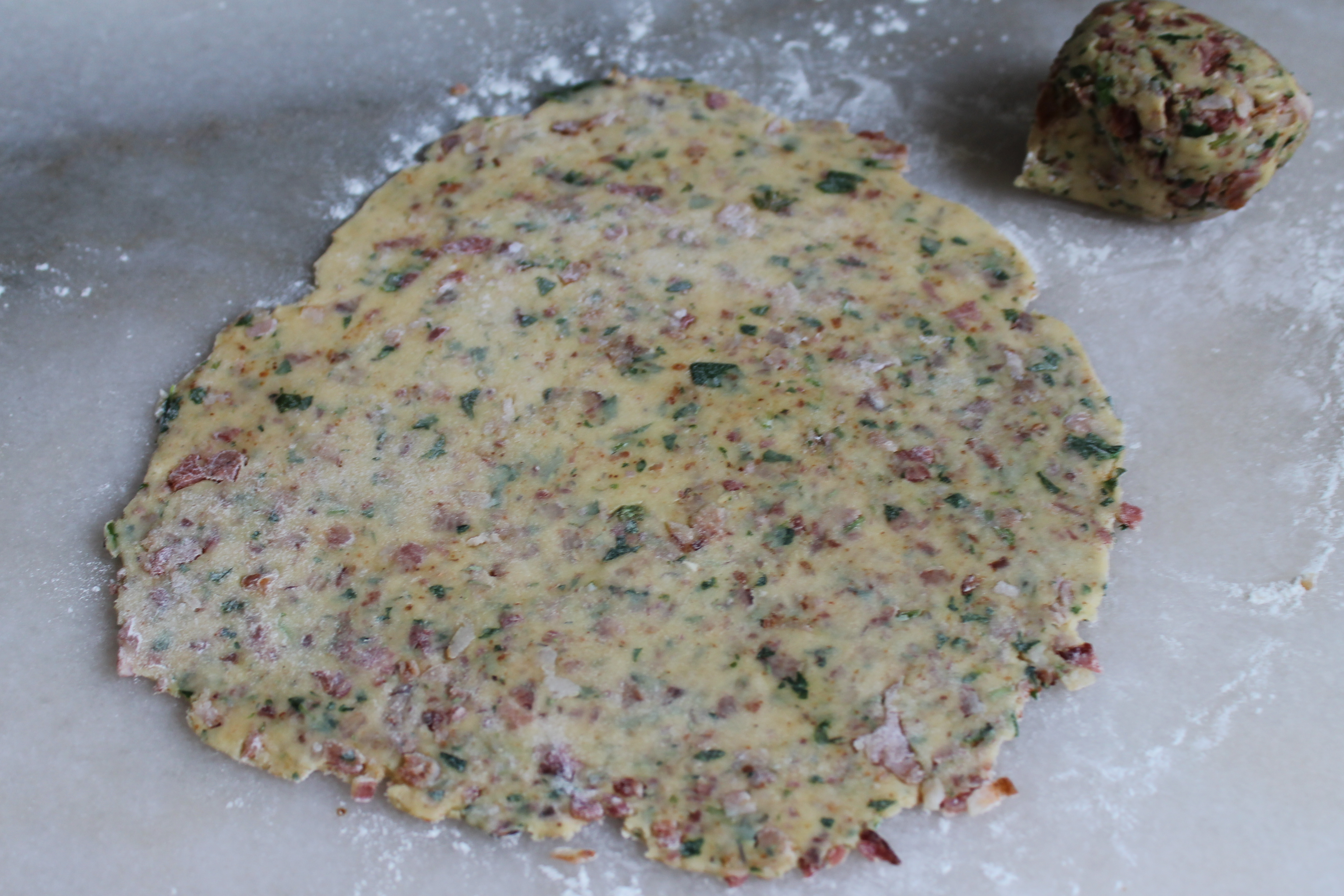 Ég flatti deigið þunnt út á hveitistráðu borði (eða marmaraplötu í þessu tilviki). Strauk mestalla beikonfituna af pönnunni sem ég steikti beikonið á með eldhúsrúllublaði og hitaði hana aftur en hafði hitann vægan.