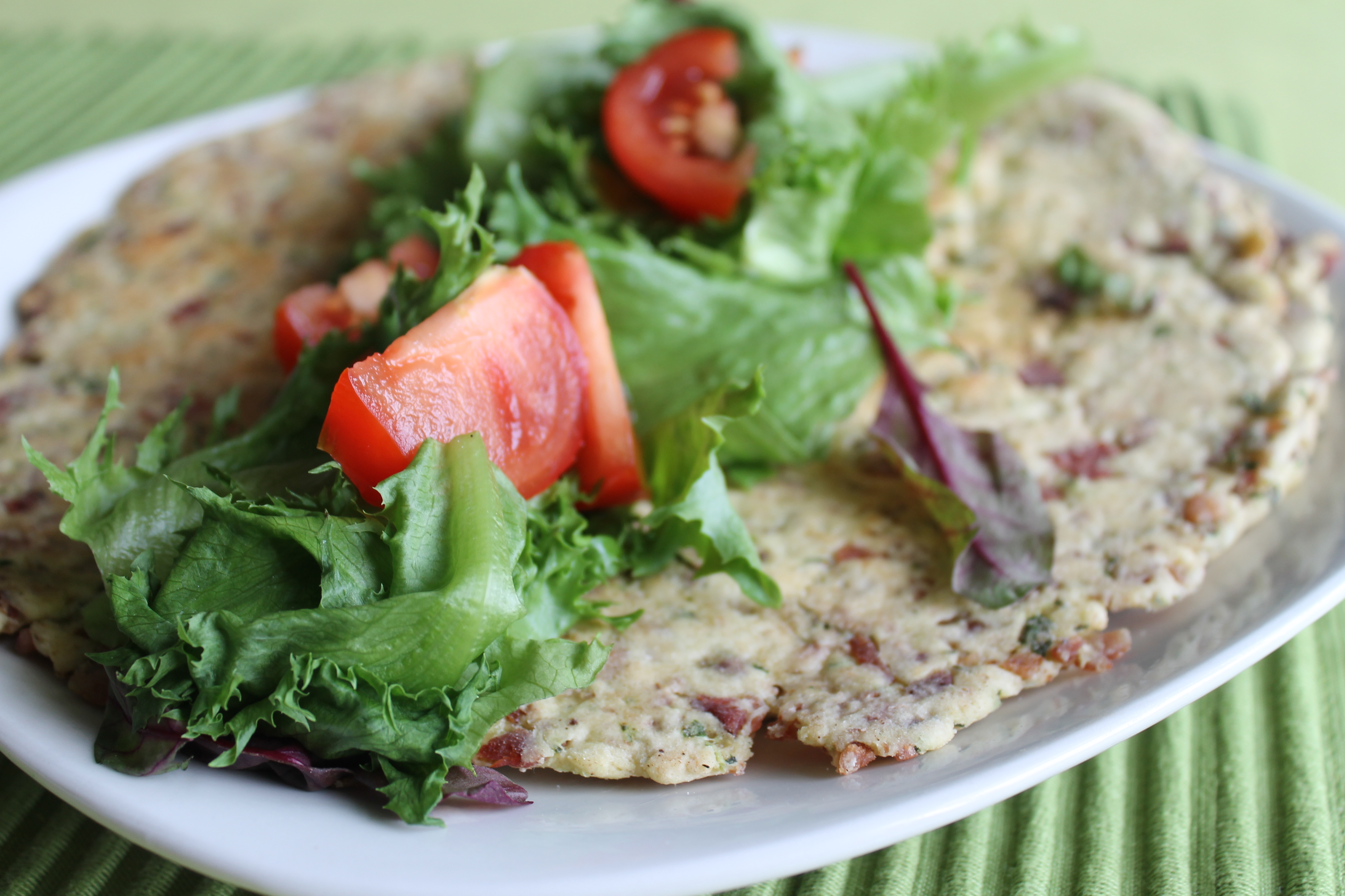 Tók flatbrauðið af pönnunni og setti það á disk. Setti salatblöð og tómata ofan á. Það mætti hafa hvað sem er, alls konar grænmeti, sósur (t.d. pestó eða kryddaða jógúrtsósu).