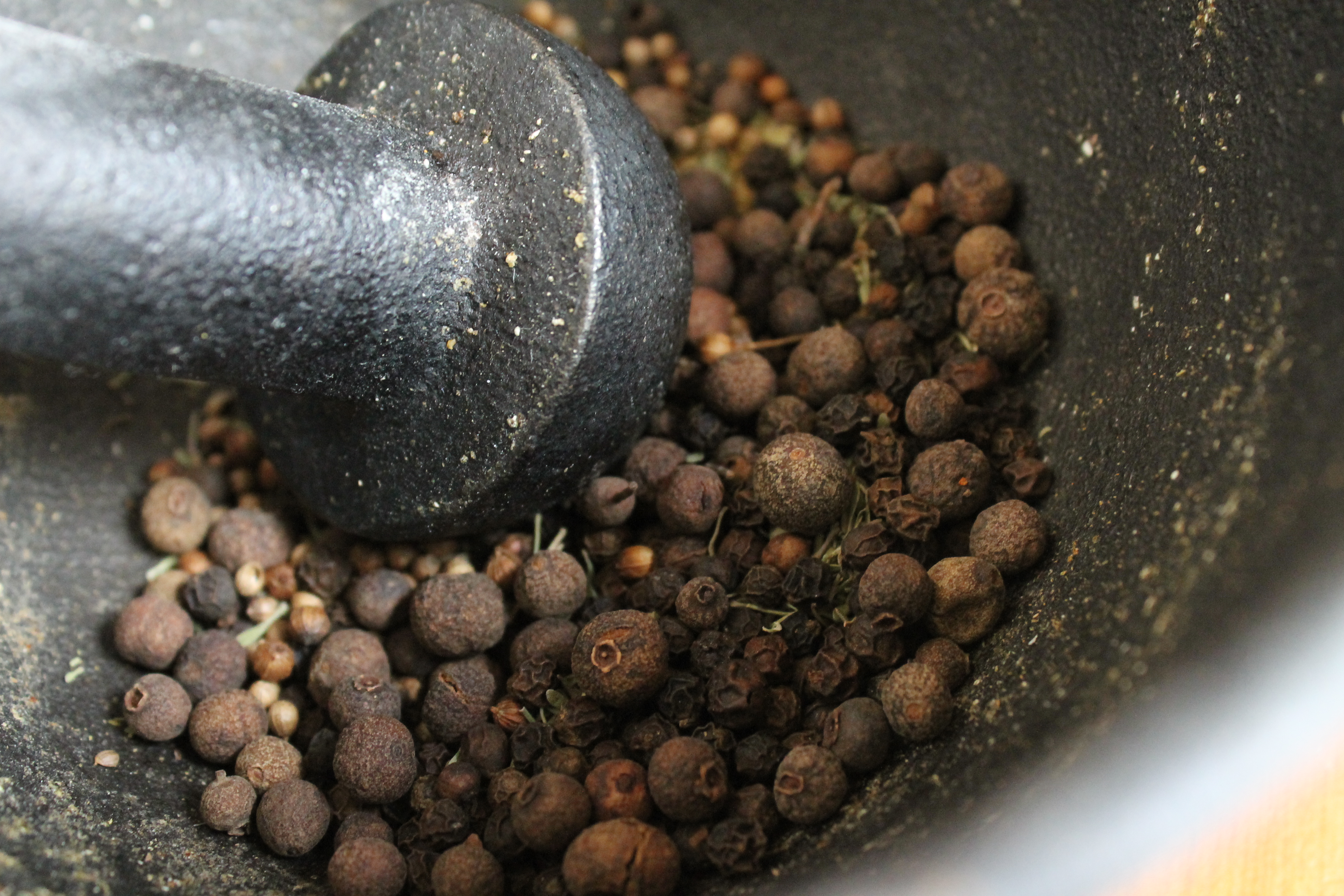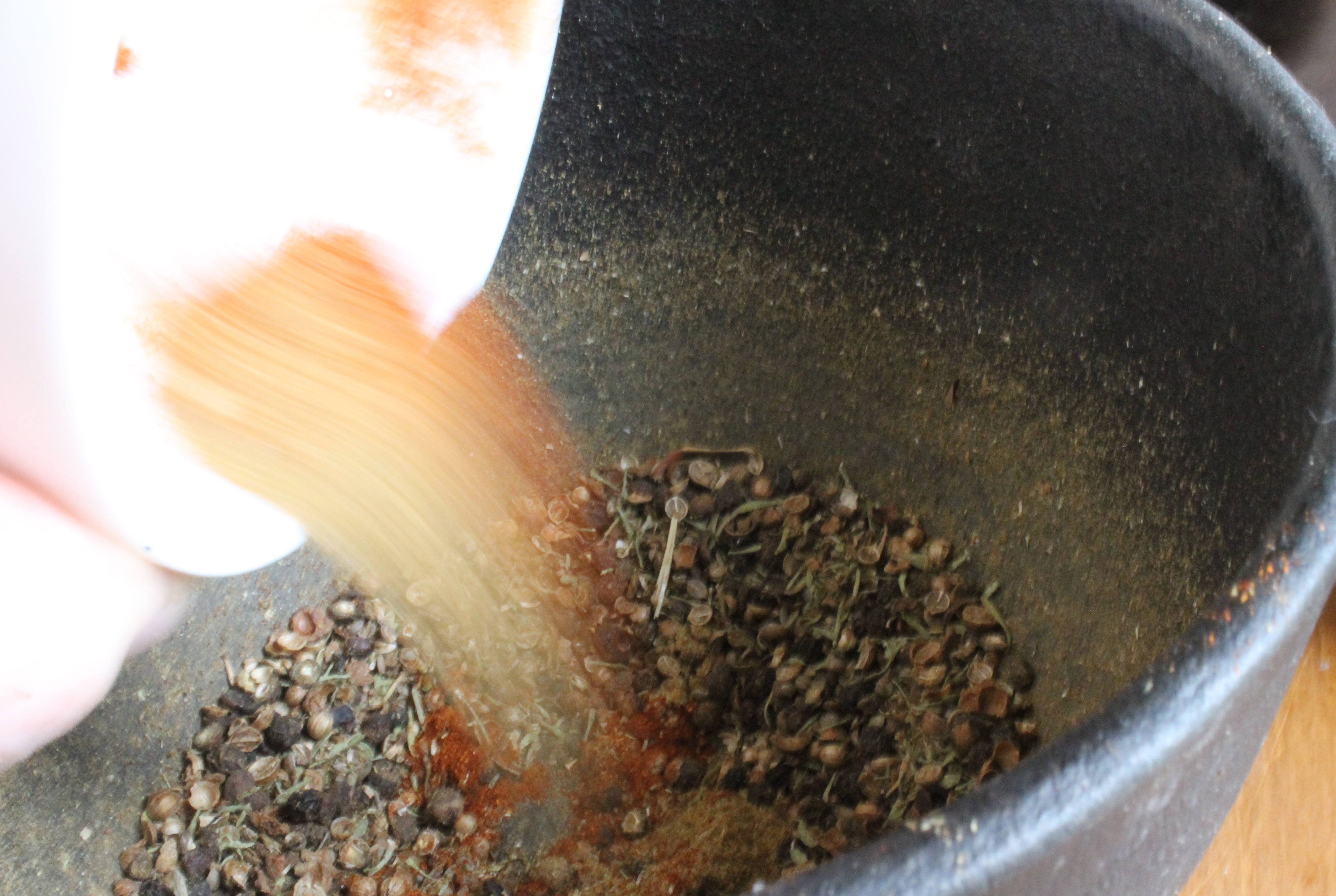 Og ég byrjaði á að setja krydd í mortélið – 1 msk af allrahandaberjum, 1 msk af kóríanderfræi, 2 tsk af svörtum piparkornum, 2 tsk þurrkað timjan, 1 msk salt – og grófsteyta það.