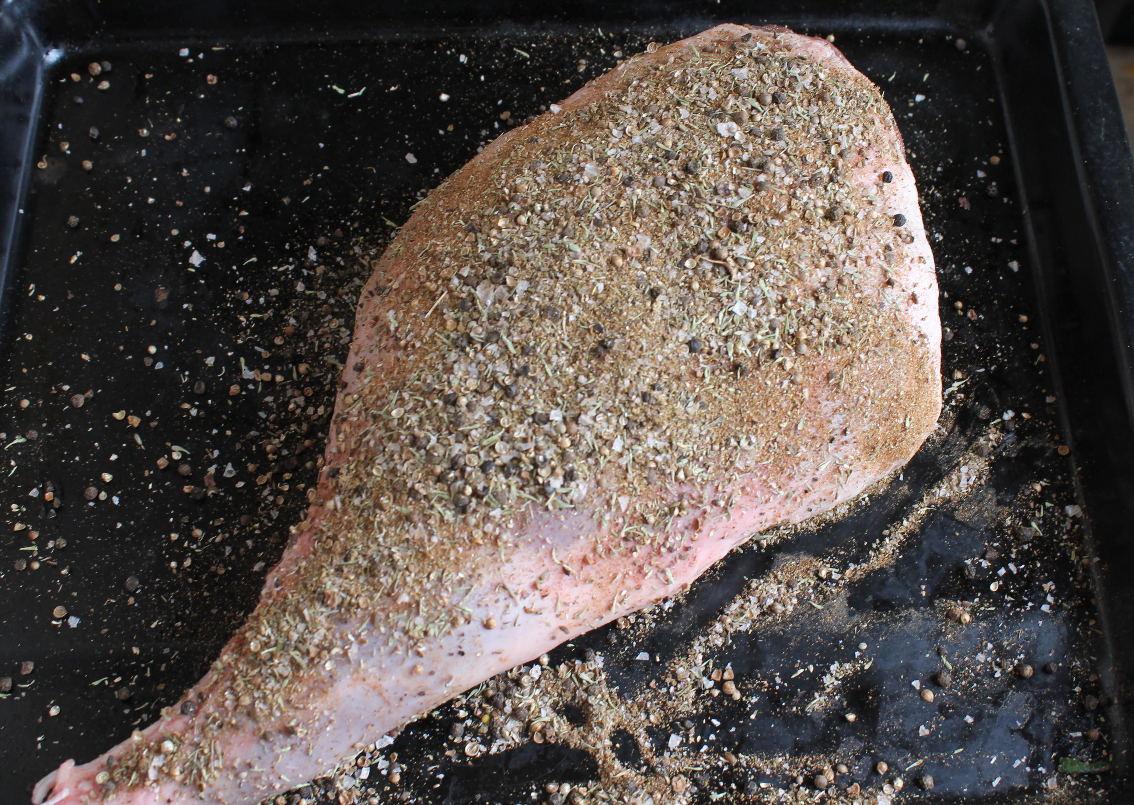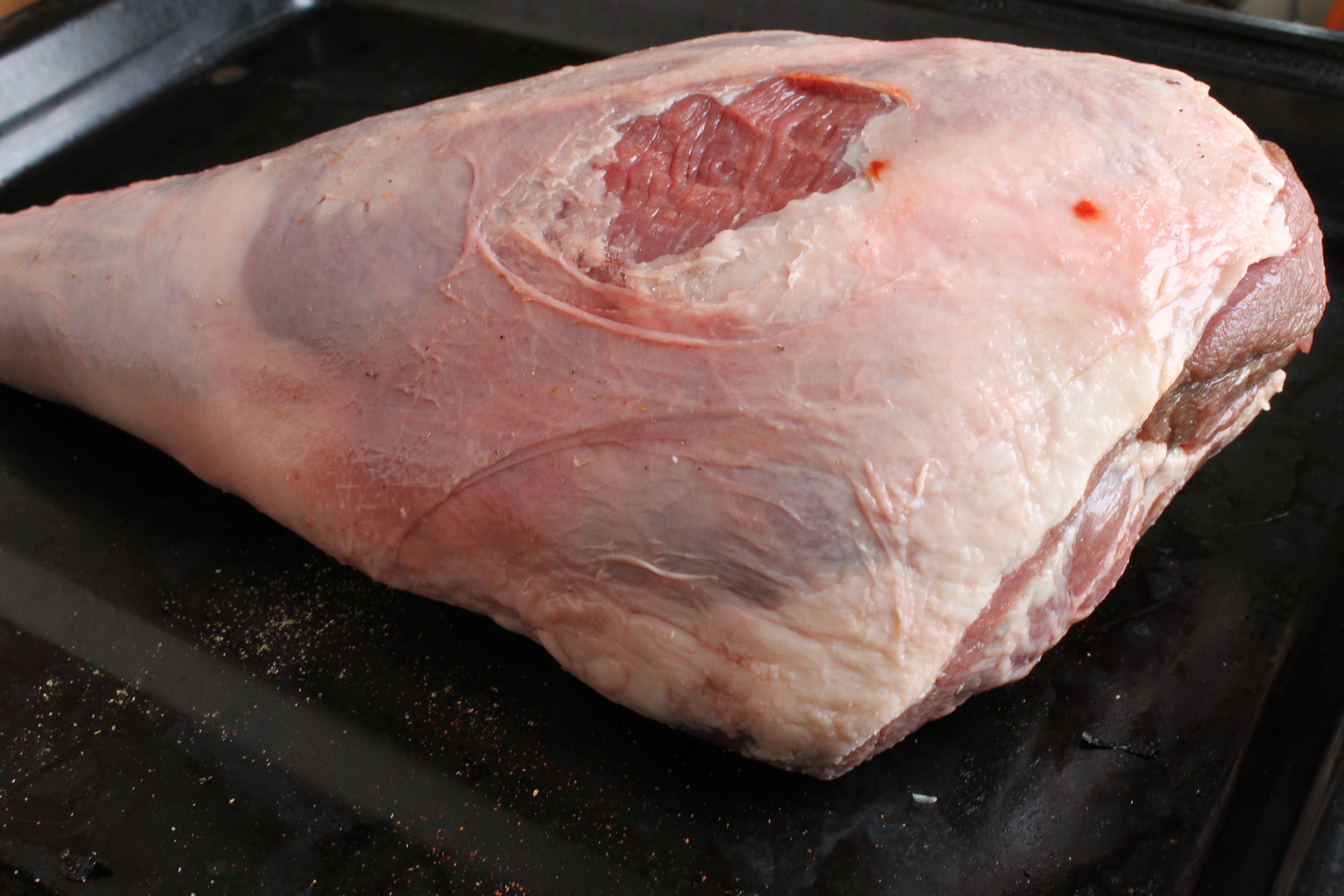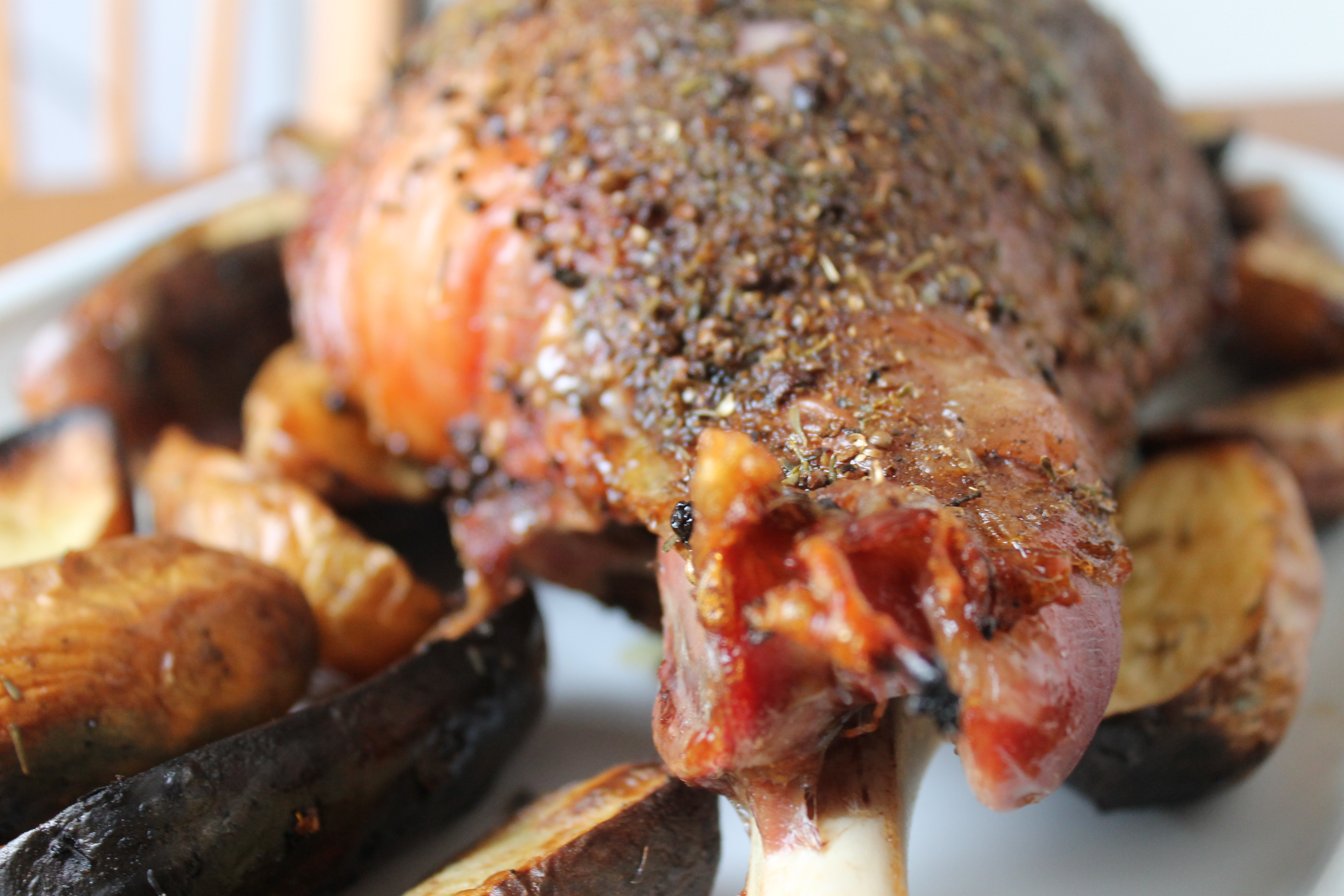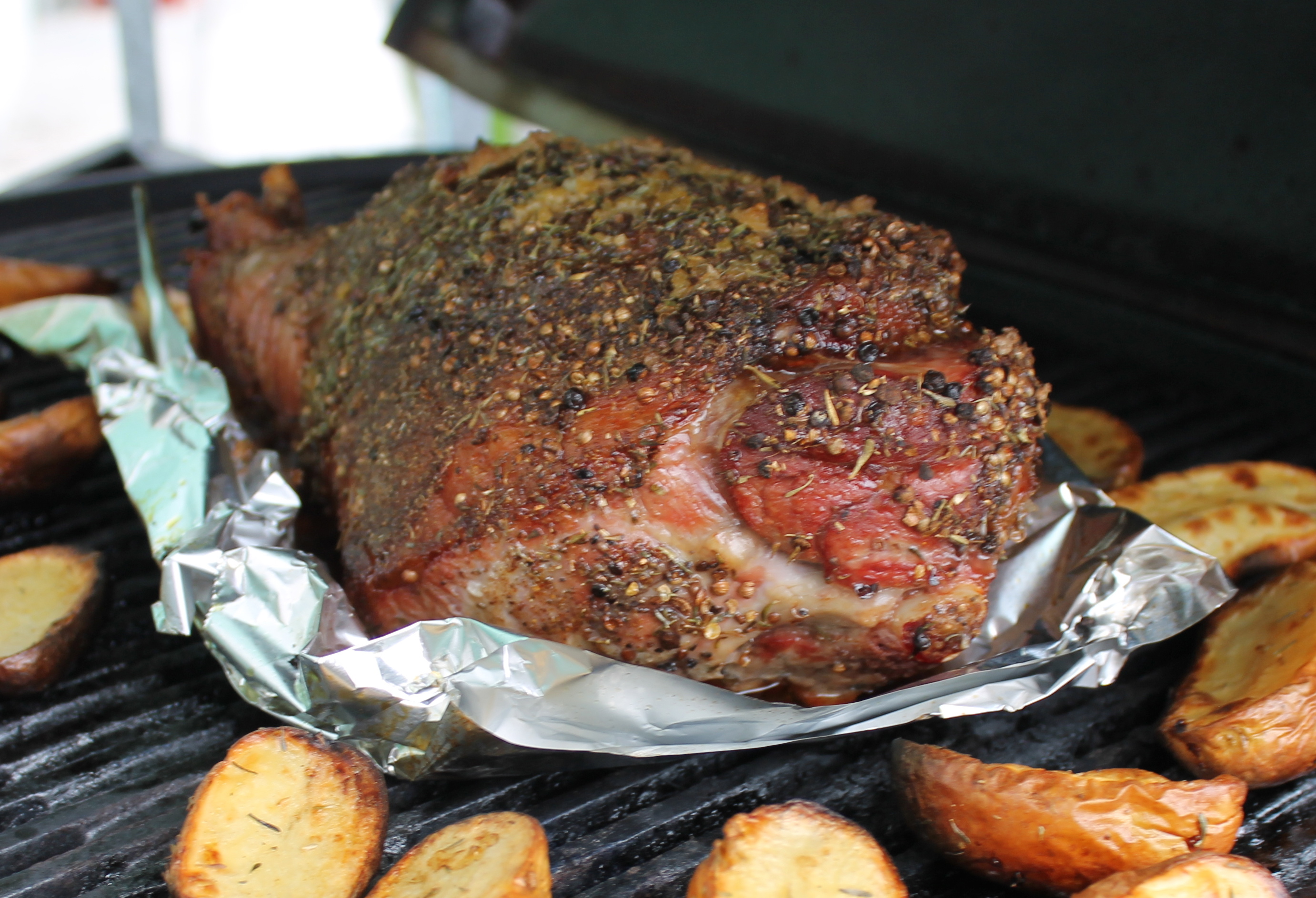 Svo dreifði ég kryddblöndunni á allar hliðar á lærinu og nuddaði því vel inn í kjötið. Lét lærið standa við stofuhita í svona tvo tíma. Hitaði grillið, setti svo lærið á það (lagði olíuborinn álpappírsbút undir, litlu stærri um sig en lærið sjálft, svo það brynni ekki), slökkti á brennaranum undir lærinu, lokaði grillinu og grillaði lærið í um 1 klst. Eftir um hálftíma skar ég kartöflur í tvennt, velti þeim upp úr kryddaðir olíu, raðaði þeim í kring með hýðið niður, lokaði grillinu aftur og lét kartöflurnar grillast í svona hálftíma.