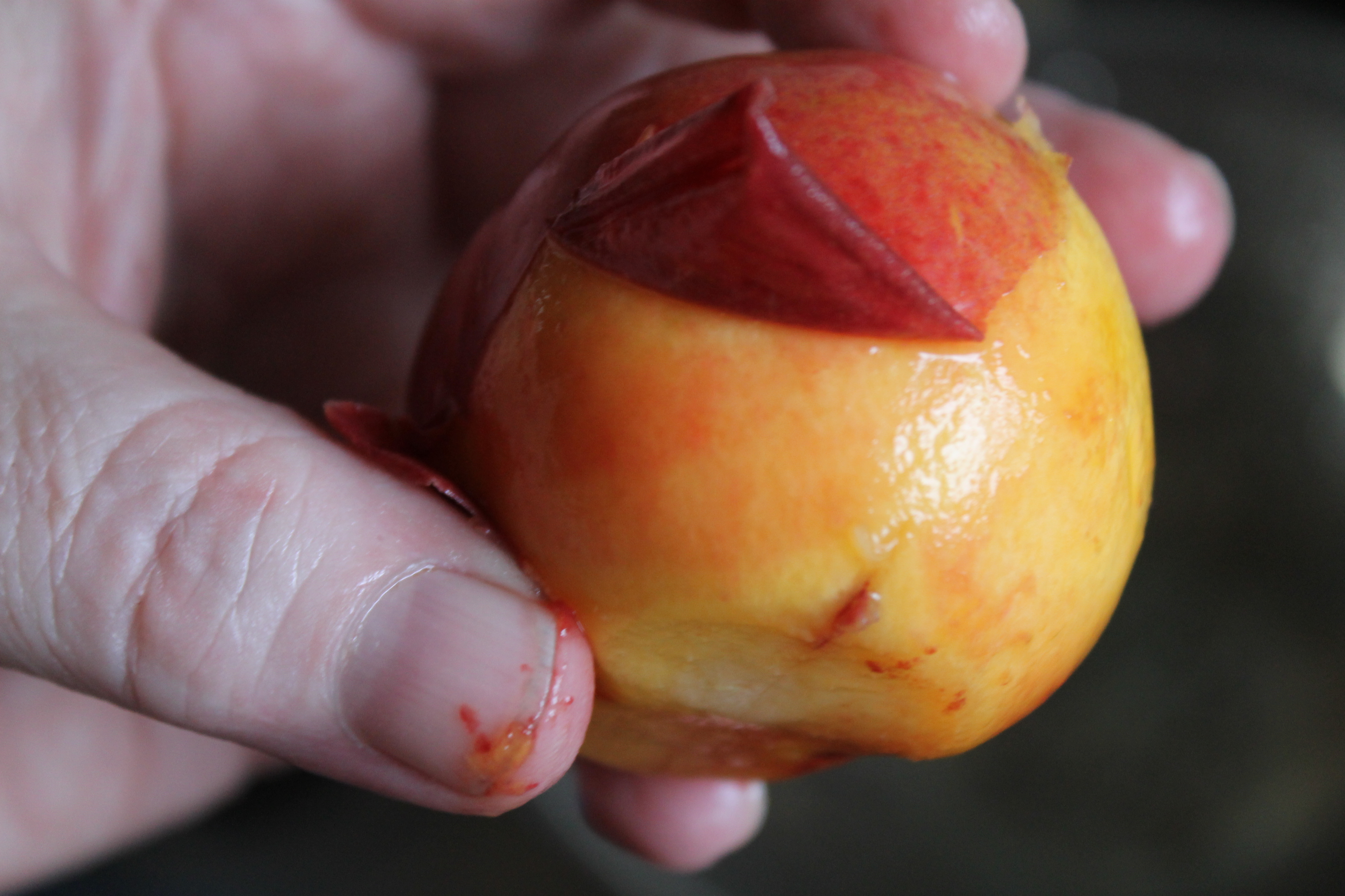 Ég skar grunnan kross í hverja  nektarínu, setti þær í skál og hellti sjóðandi vatni yfir. Lét standa í tæpa mínútu, hellti vatninu þá af og lét kalt vatn buna á þær. Það er mun auðveldara að flysja þær ef þetta er gert. En það má auðvitað líka nota bara hníf (eða hafa hýðið á þeim en það er svolítið seigt). En það má sjá að hýðið er aðeins að byrja að losna.