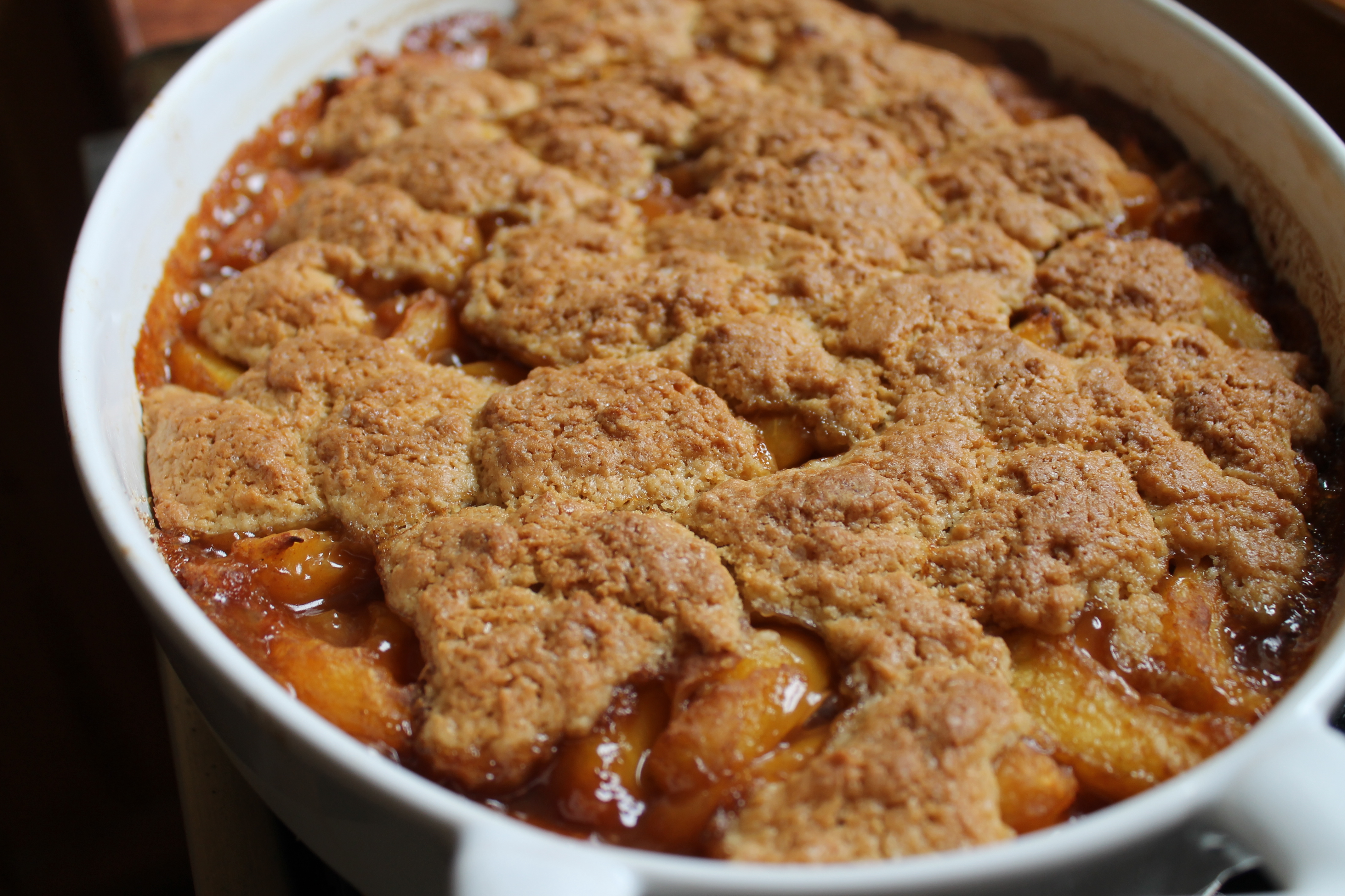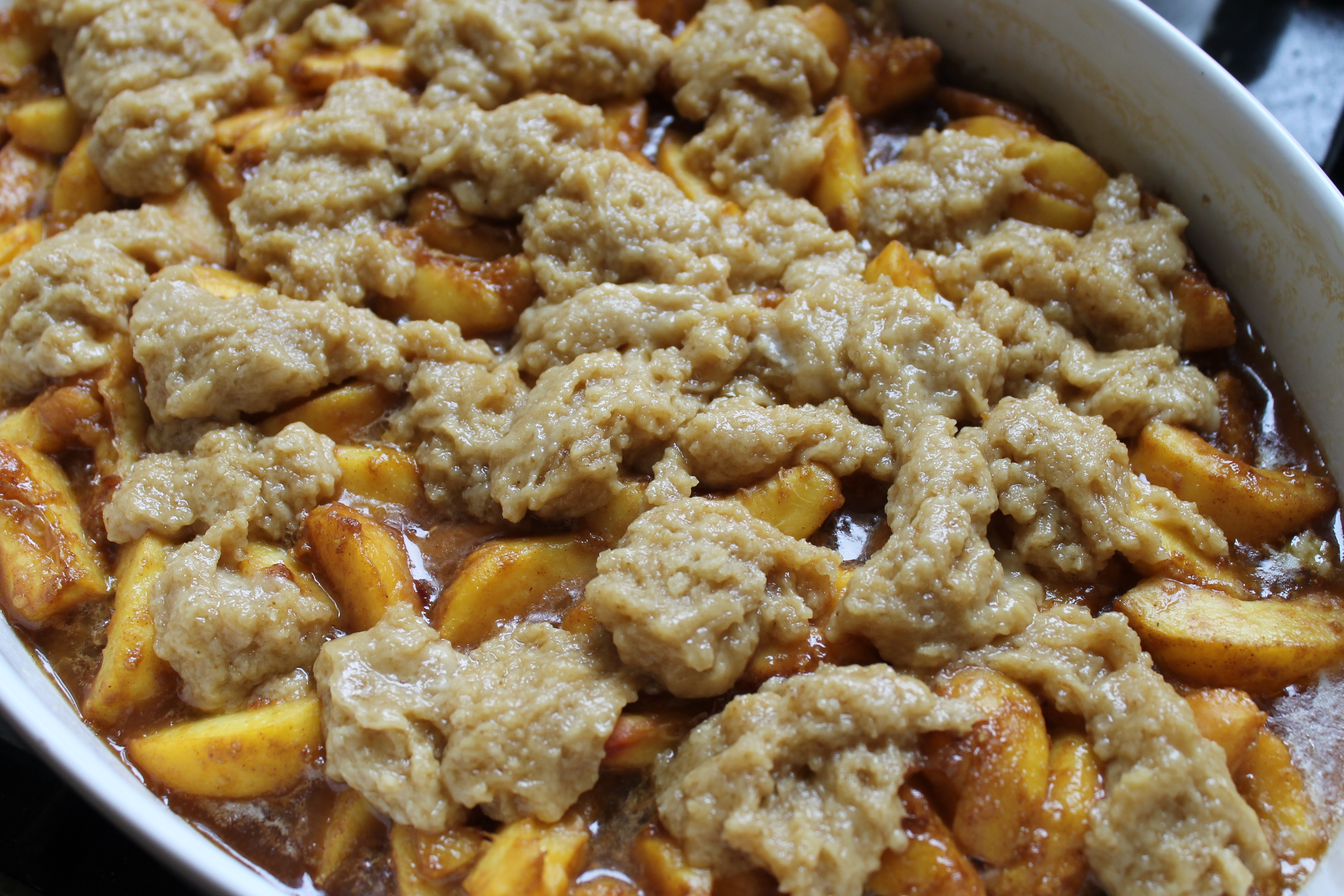 Á meðan blandaði ég saman í matvinnsluvélinni 125 g af hveiti, 75 g af köldu smjöri í teningum, 4 msk af púðursykri, 4 msk af sykri, 3/4 tsk af lyftidufti og örlitlu salti. Bætti svo við um 4 msk af heitu vatni – deigið á að vera það lint að það sé hægt að sletta því yfir ávextina með skeið. Sem ég gerði, tók formið úr ofninum og dreifði deiginu yfir. En það á ekkert að vera að reyna að jafna úr því eða slétta yfirborðið og það mega alveg vera stór göt á milli.