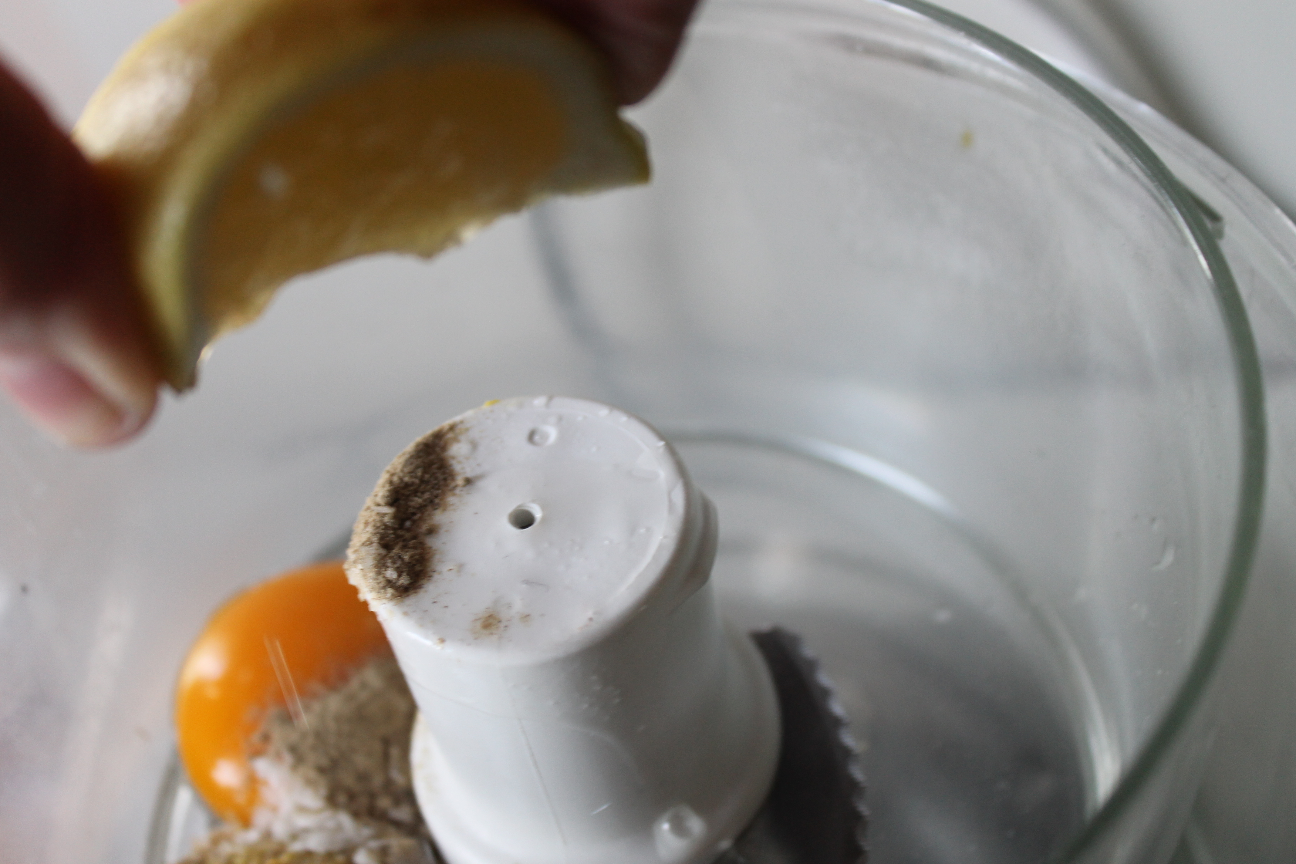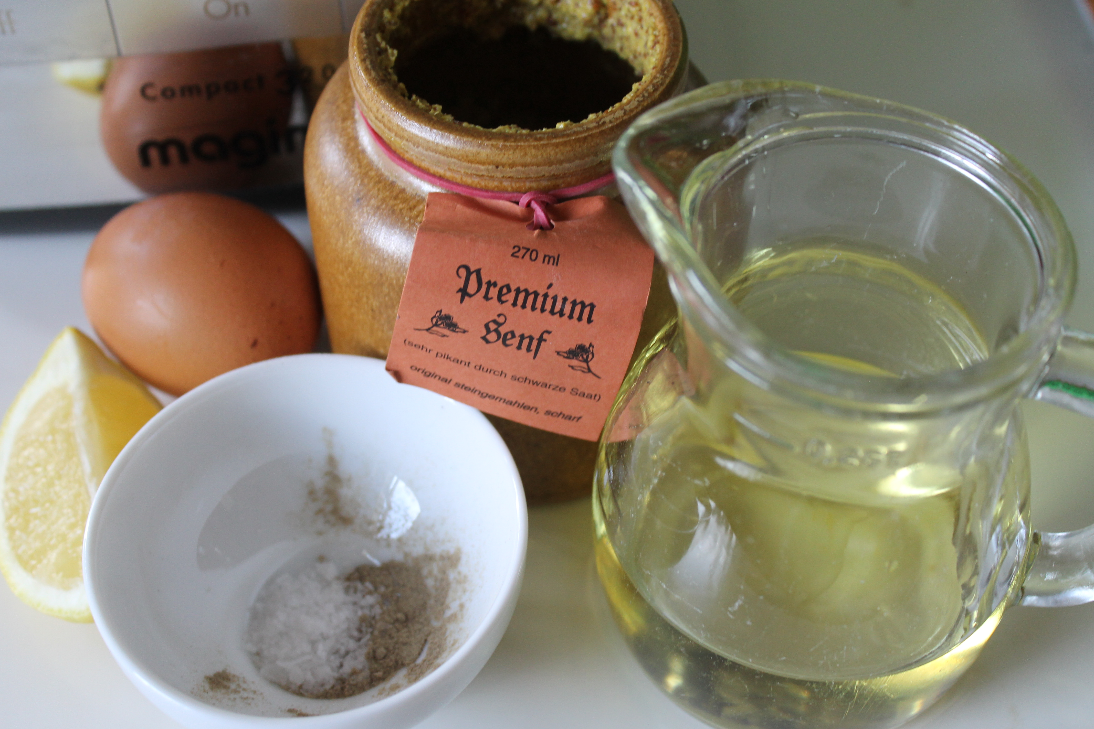 Ég var bara að gera lítinn skammt svo að ég notaði litlu skálina á matvinnsluvélinni, hefði líka getað notað blandara ef ég ætti hann (eða gæti fundið hann, ég er viss um að ég á hann einhvers staðar eins og ég sagði um daginn) og setti í hana eina eggjarauðu, smávegis sinnep (svona hálfa sléttfulla teskeið; ef þetta væri plein majónes hefði ég notað fínkorna sinnep en ég var með grófkorna þar sem þetta á að vera sinnepsmajónes), pipar og salt og kreisti svo safann úr fjórðungi af sítrónu yfir.