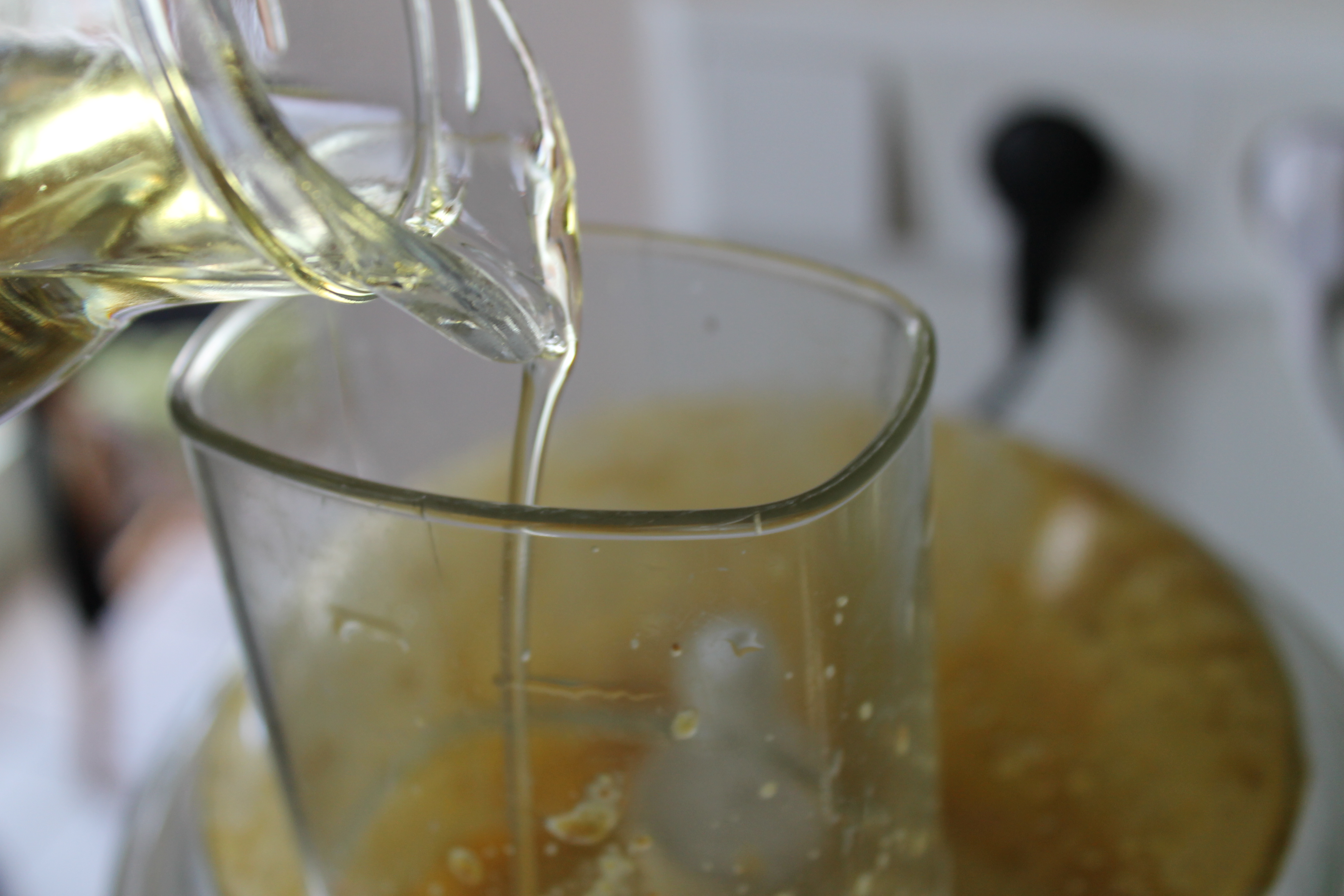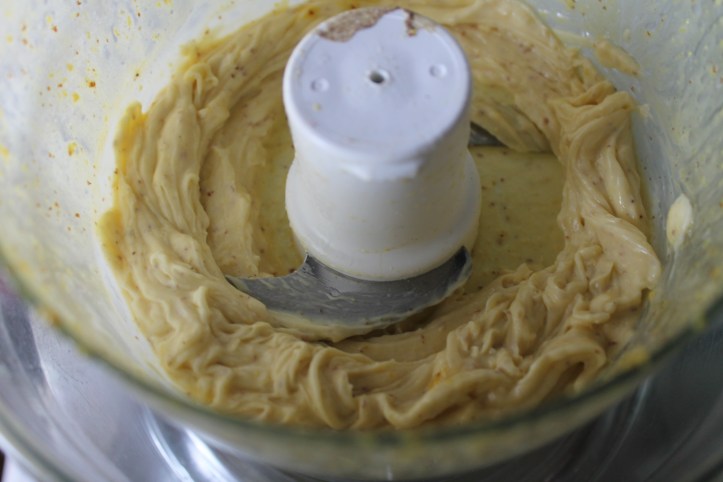 Ég þeytti þetta saman og svo hellti ég 150 ml af olíu smátt og smátt saman við í mjórri bunu og lét vélina ganga á fullum hraða á meðan. Sósan er fyrst þunn og fljótandi en þykknar smátt og smátt eftir því sem meiri olíu er þeytt saman við.