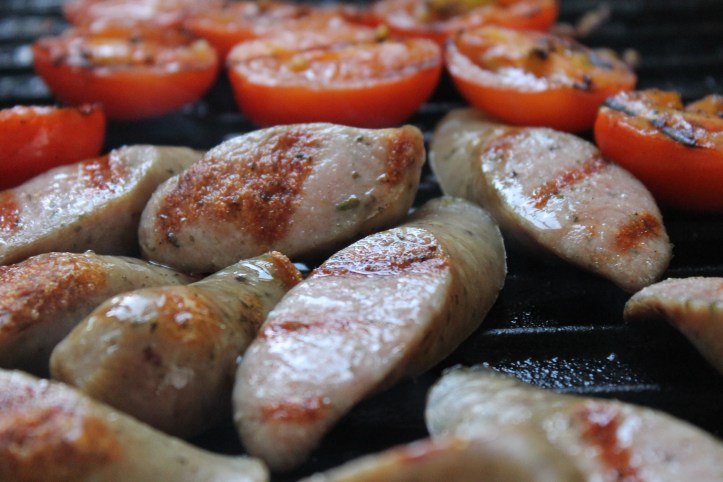 Á meðan skar ég bratwurstpylsurnar í sneiðar á ská og skar nokkra kokkteiltómata í helminga. Hitaði grillpönnu, penslaði hana með olíu og steikti pylsur og tómata á báðum hliðum.