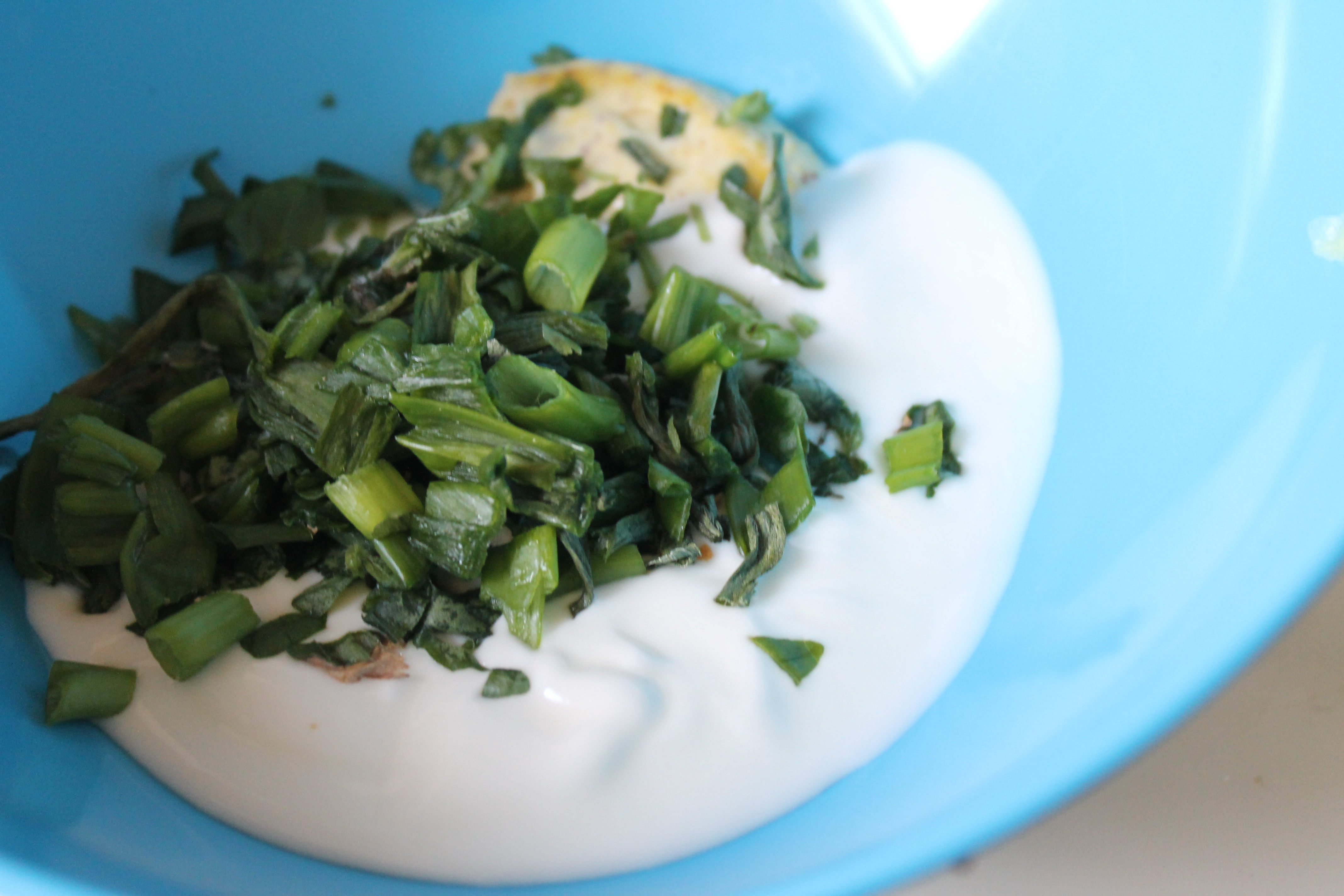 Hrærði nokkrum matskeiðum af hreinni jógúrt (eða sýrðum rjóma eða whatever) saman við, ásamt nokkrum söxuðum basilíkublöðum, grænu blöðunum af 2-3 vorlaukum og 1 msk af smátt söxuðum sýrðum gúrkum saman við.