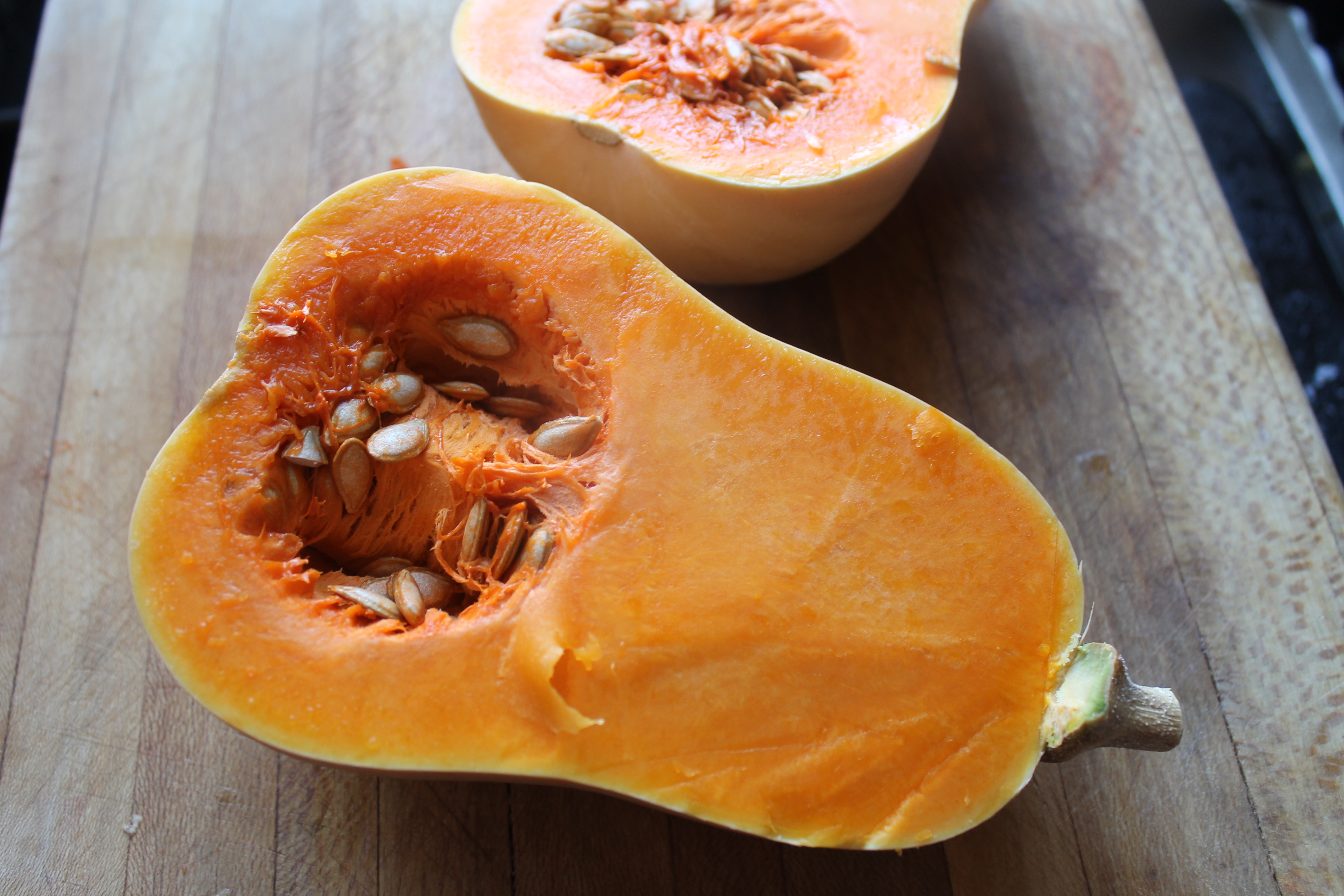 Þá mundi ég að ég átti lítinn butternut-kúrbít heima. Ssm er náttúrlega allt annar handleggur en venjulegur kúrbítur, sem er sumarkúrbítur en butternut-kúrbíturinn er vetrarkúrbítur og líkari graskeri, enda kalla sumir hann butternut-grasker. En þetta er sosum ekki grasker heldur.