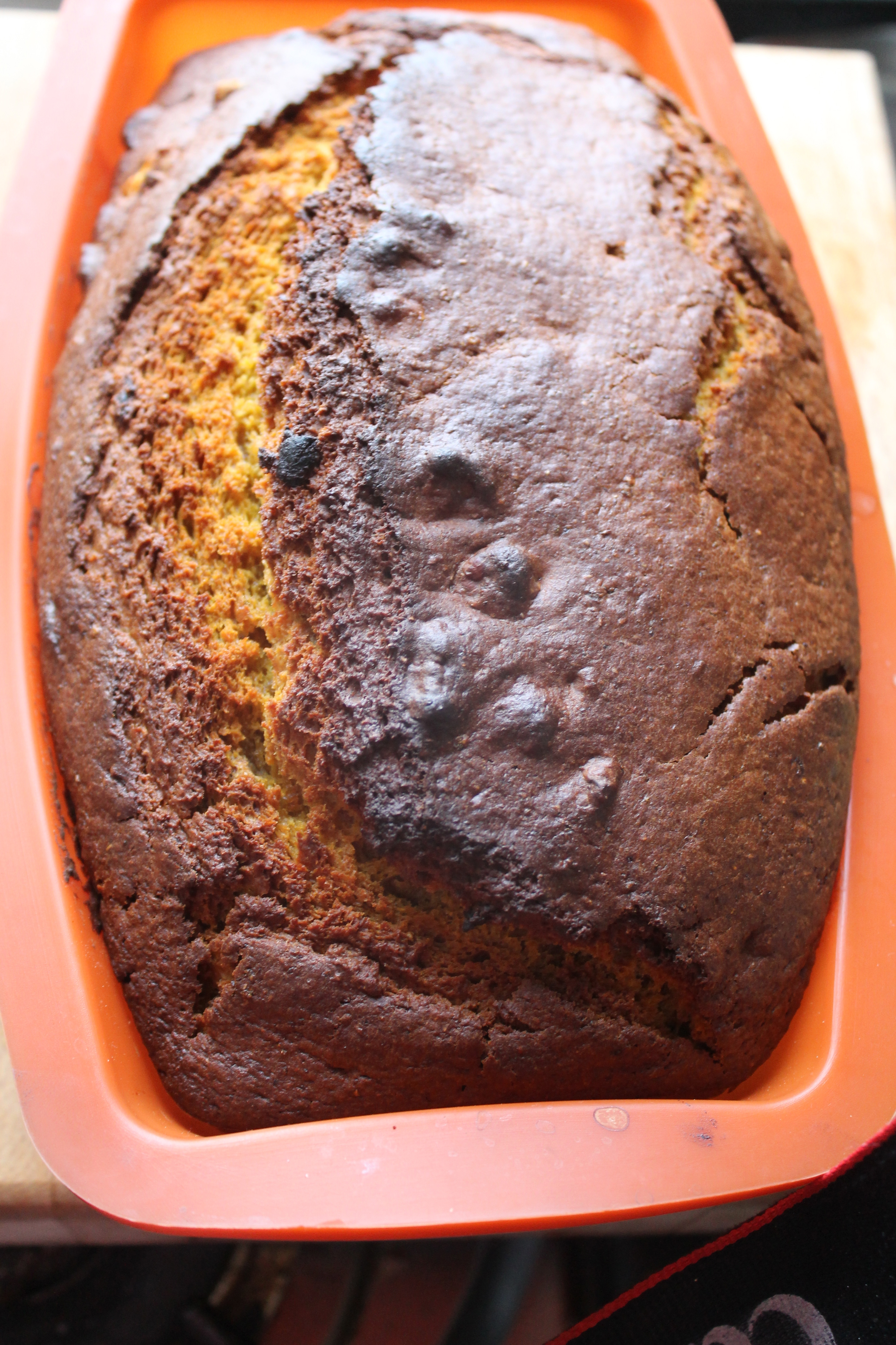 Og hér kom böggið: þegar ég var búin að snúast þrjá hringi í kringum sjálfa mig að leita að jólakökuforminu sem ég ætlaði að baka kökuna í mundi ég að það var orðið ónýtt og ég henti því í vetur og hef ekki komið því í verk að kaupa nýtt. Ég átti bara silíkonform. Og ég vissi að það væri ekki nógu gott því hliðarnar á því eru ekki nógu stífar. Allt í lagi þegar maður er með frekar lítið deig í því, upp á miðjar hliðar eða minna, en þetta deig fyllti næstum formið. En það var ekki um annað að ræða og ég setti deigið í það og stakk því inn í ofninn á neðstu rim.