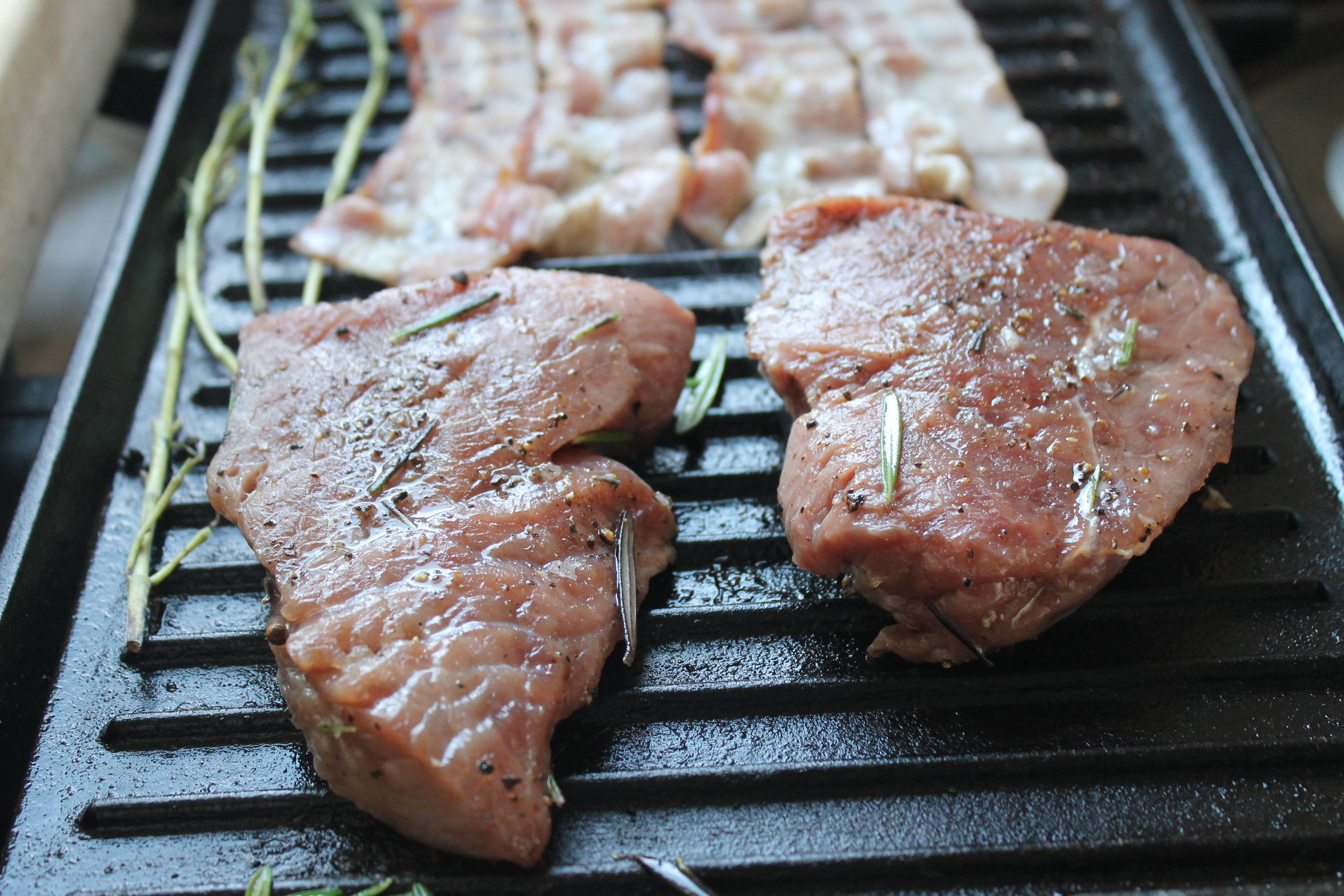 Ég skóf svo mestallt rósmarínið af kjötinu (gerir samt ekkert til þótt eitthvað verði eftir), setti það á vel heita pönnuna og grillsteikti það í svona fjórar mínútur á hvorri hlið. Eða eftir þykkt og smekk.