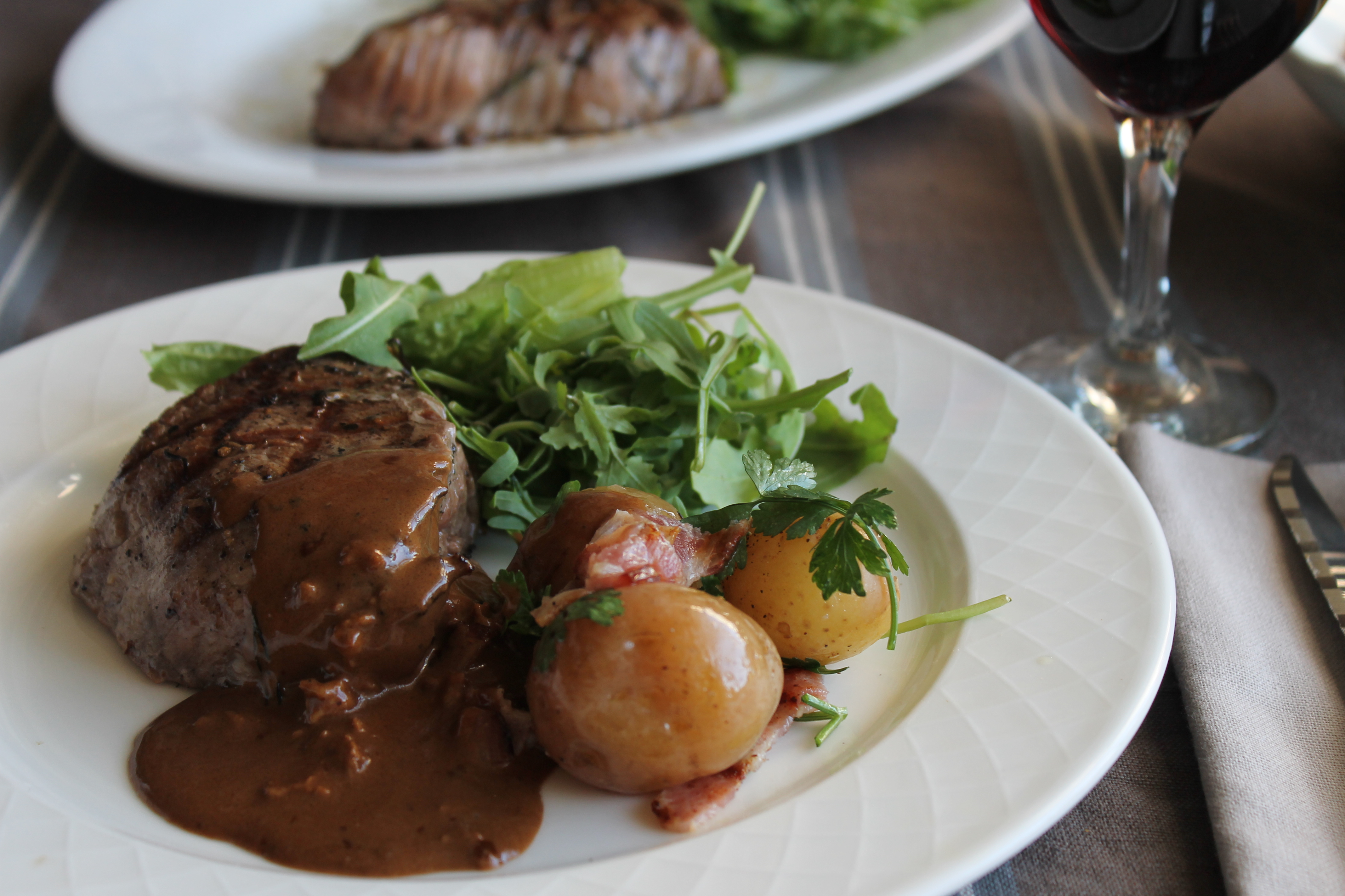 Til hvers ætti maður að vera að fara eitthvað um verslunarmannahelgina þegar hægt er að hafa það svona gott heima hjá sér? – Kjötið var fínt, sósan góð, en beikonkartöflurnar voru alveg meiriháttar.