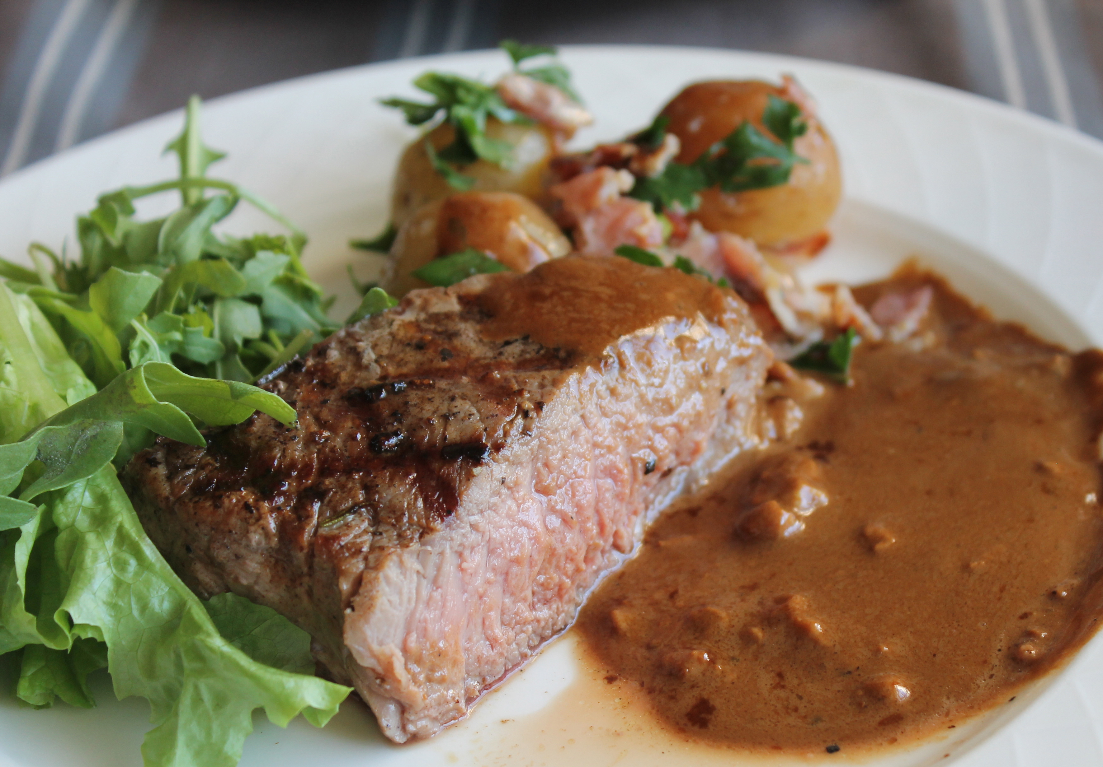 Á meðan kjötið steiktist setti ég 250 ml af rjóma í pott ásamt rúmlega hálfum veeel þroskuðum Bónus-Kastala sem ég átti til, teskeið af kjötkrafti, matskeið af púrtvíni (má sleppa), hálfri teskeið af dijon-sinnepi og dálitlum pipar. Hitaði þetta og hrærði þar til það var vel samlagað og osturinn bráðinn og bætti þá við svolitlum sósulit og smakkaði sósuna til.