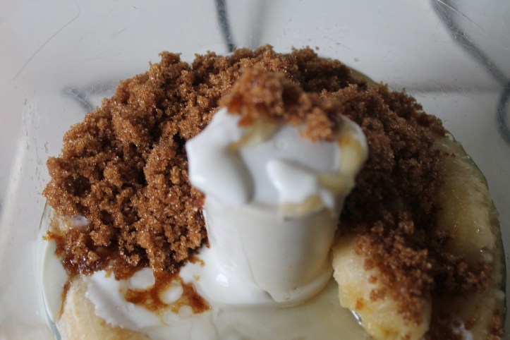 Ég hitaði ofninn í 185°C. Flysjaði banana og setti þá í matvinnsluvélina ásamt 150 ml af hreinni jógúrt (má vera súrmjólk eða AB-mjólk), 100 g af púðursykri, 85 ml af olíu og 1 eggi. Matvinnsluvélin er ekkert nauðsynleg, það má stappa bananana með gaffli og hræra svo öllu hinu saman við þá í skál með sleif eða sleikju.
