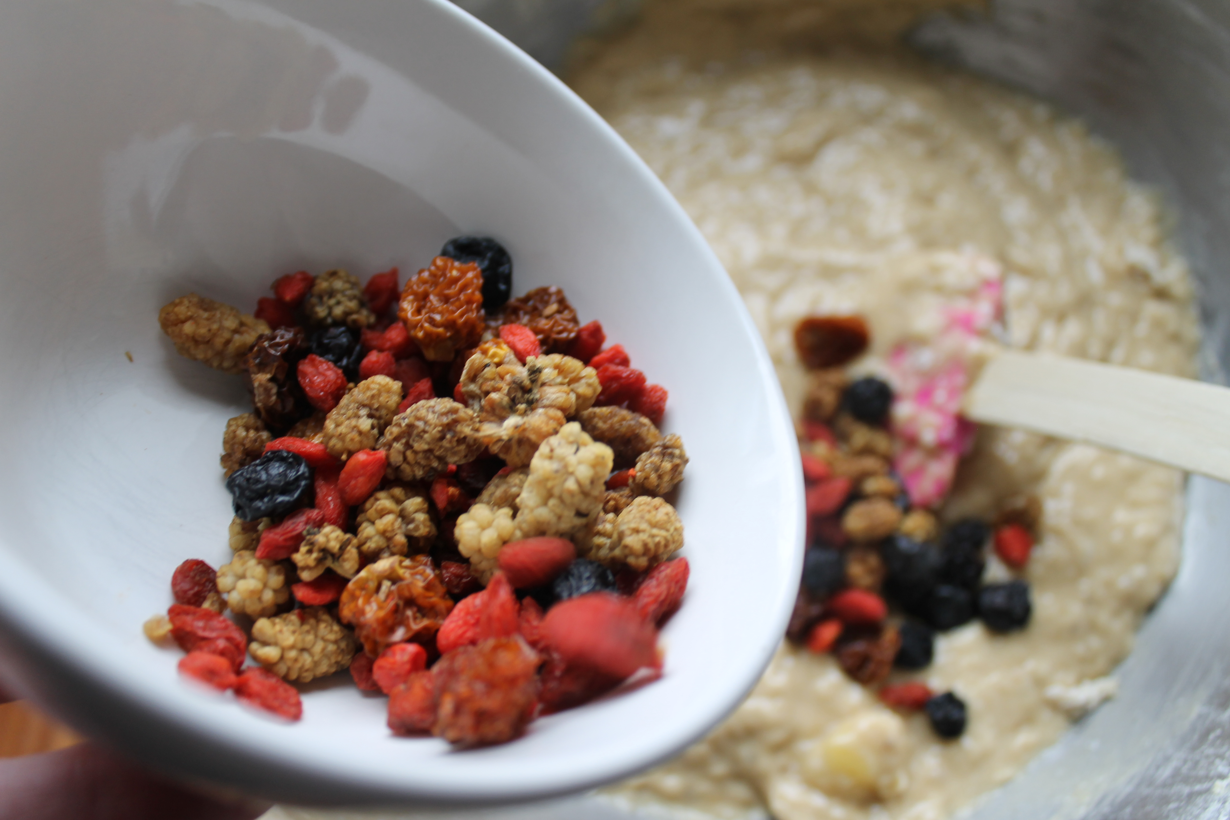 Já, þetta eru einhver ofur-heilsuber. Goji-ber og hvaðeina. Nei, ég er ekki komin á eitthvert hollustutripp. Mér þykja bara þurrkuð ber góð upp til hópa og þetta var skemmtileg tilbreyting. Einn poki (80 g) af berjablöndu (goji-ber, múltuber, bláber, blæjuber) frá Góðu fæði. En það mætti alveg eins nota eitthvað annað – trönuber, rúsínur, eða sleppa berjunum og nota e.t.v hnetur. Eða súkkulaðibita. Eða láta bananana bara duga.
