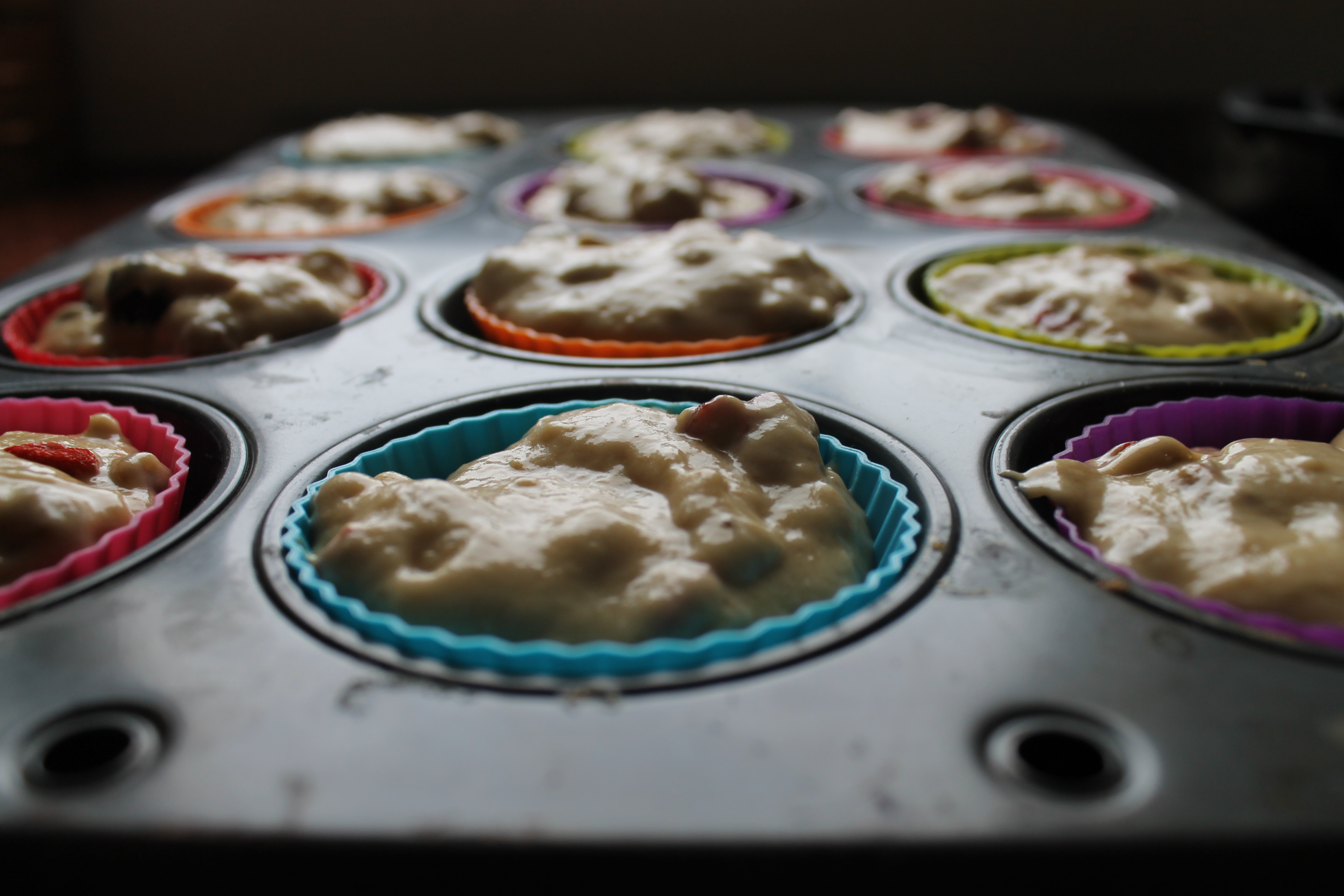 Ég tók málm-múffuformið mitt, sem einu sinni átti að heita viðloðunarfrítt en er það allavega ekki lengur, og setti í það tólf sílikonmúffuform. Sem eru mikil snilld; það má nota pappírsform til að klæða málmformið en þá má alltaf búast við að eitthvað af múffunni sitji eftir á pappírnum (nema sé þeim mun meiri feiti í deiginu) og svo má auðvitað nota pappírsform eingöngu og raða þeim á bökunarplötu en þá er yfirleitt ekki hægt að setja mikið í formin og múffurnar renna meira og minna út.
