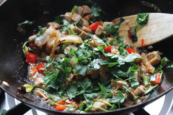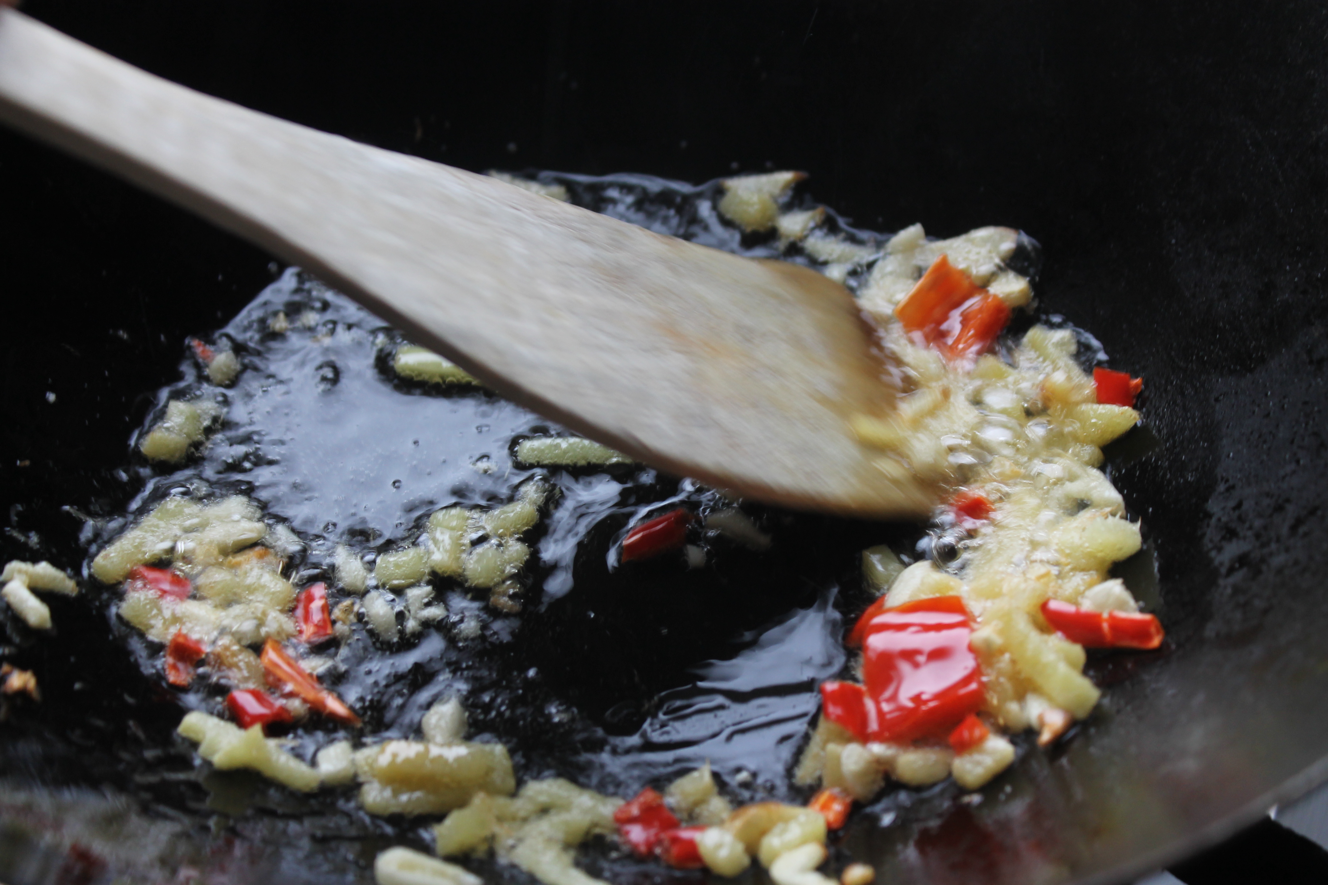 Ég hitaði wokpönnuna á kraftmestu hellunni á gasvélinni, setti svona tvær matskeiðar af olíu á hana (hefði eiginlega átt að vera jarðhnetuolía en ég átti hana ekki svo að repjuolía varð að duga) á pönnuna og setti svo hvítlauk, chili og engifer á pönnuna og veltisteikti við háan hita í svona hálfa mínútu. (Veltisteiking er orð sem ég hef notað um stir-fry; það er allavega skárra en hræristeiking, sem ég hef séð notað. Sérstaklega þega stendur,,hræristeiktur kjúklingur“, ég les það alltaf sem hræsteiktur kjúklingur og það hljómar ekki vel.)