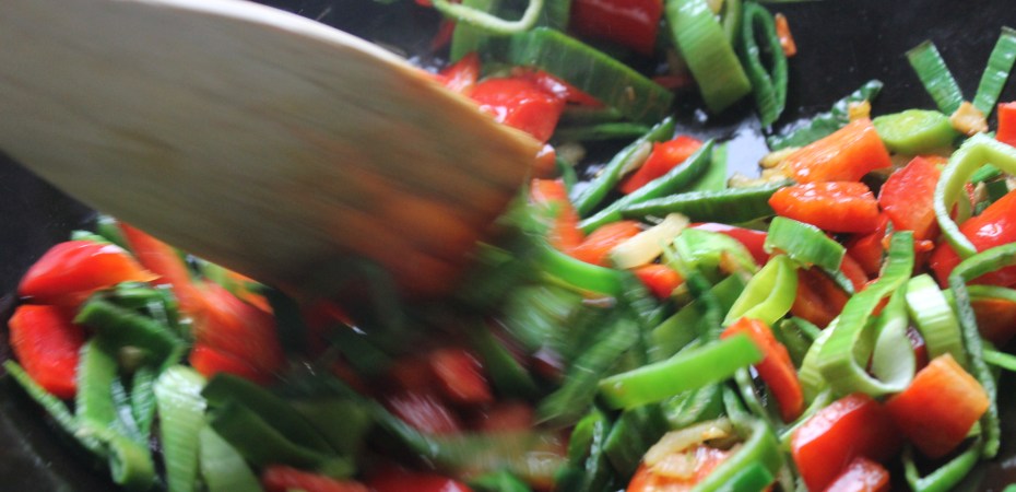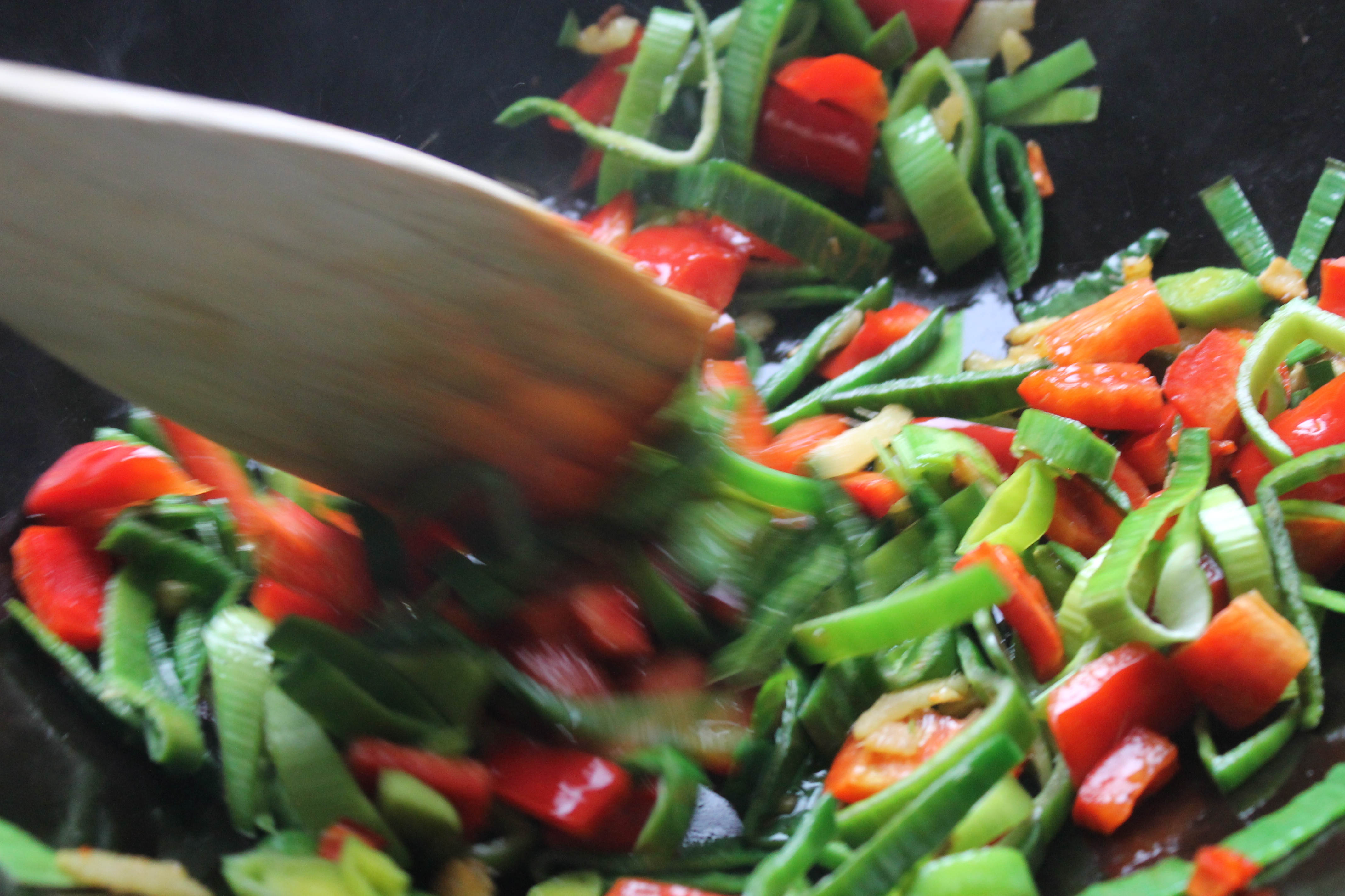 Þá setti ég papriku og blaðlauk á pönnuna og veltisteikti áfram í 2-3 mínútur. Hafði hitann háan en gætti þess að grænmeti brynni ekki.