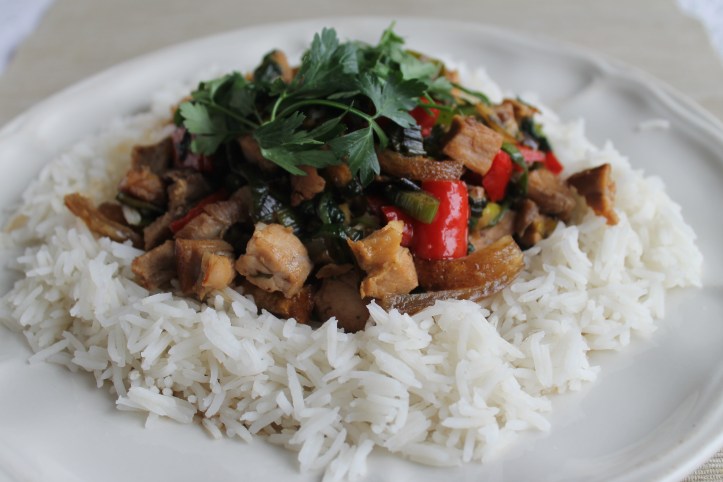 Ég átti náttúrlega töluverðan afgang af svínasíðunni sem ég steikti á föstudaginn og þurfti að fara að nota hana. Ég er ekki vön að henda mat og reyni að nota alla afganga – annaðhvort í nestið í vinnuna eða bý til eitthvað allt annað úr þeim eftir einn eða tvo daga. Þrjá í þessu tilviki. Auðvitað henta afgangar misvel til slíks en ef maður hefu sæmilegt hugmyndaflug er alltaf hægt að gera eitthvað … Og svínasíðubita er reyndar hægt að nota í ansi margt.