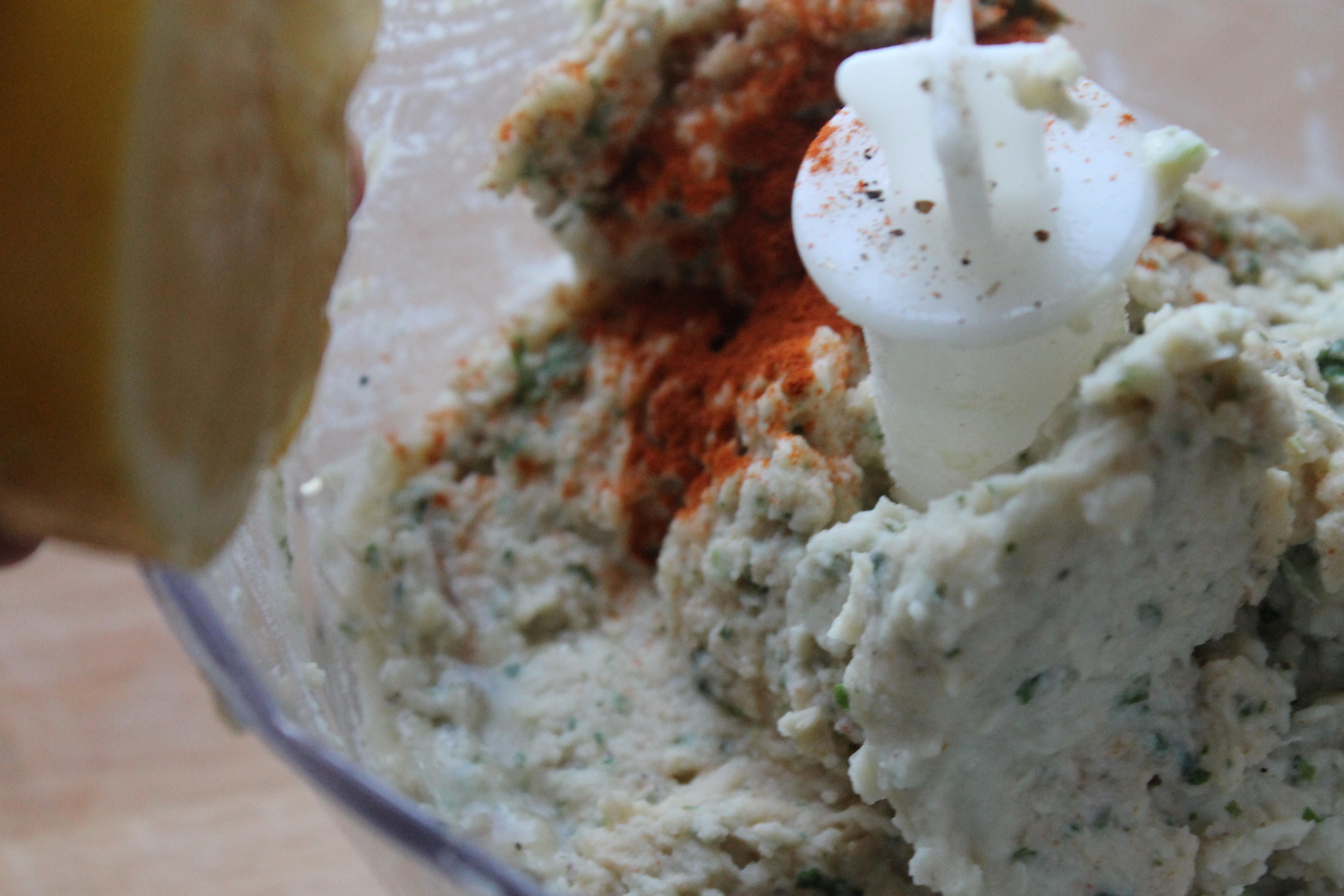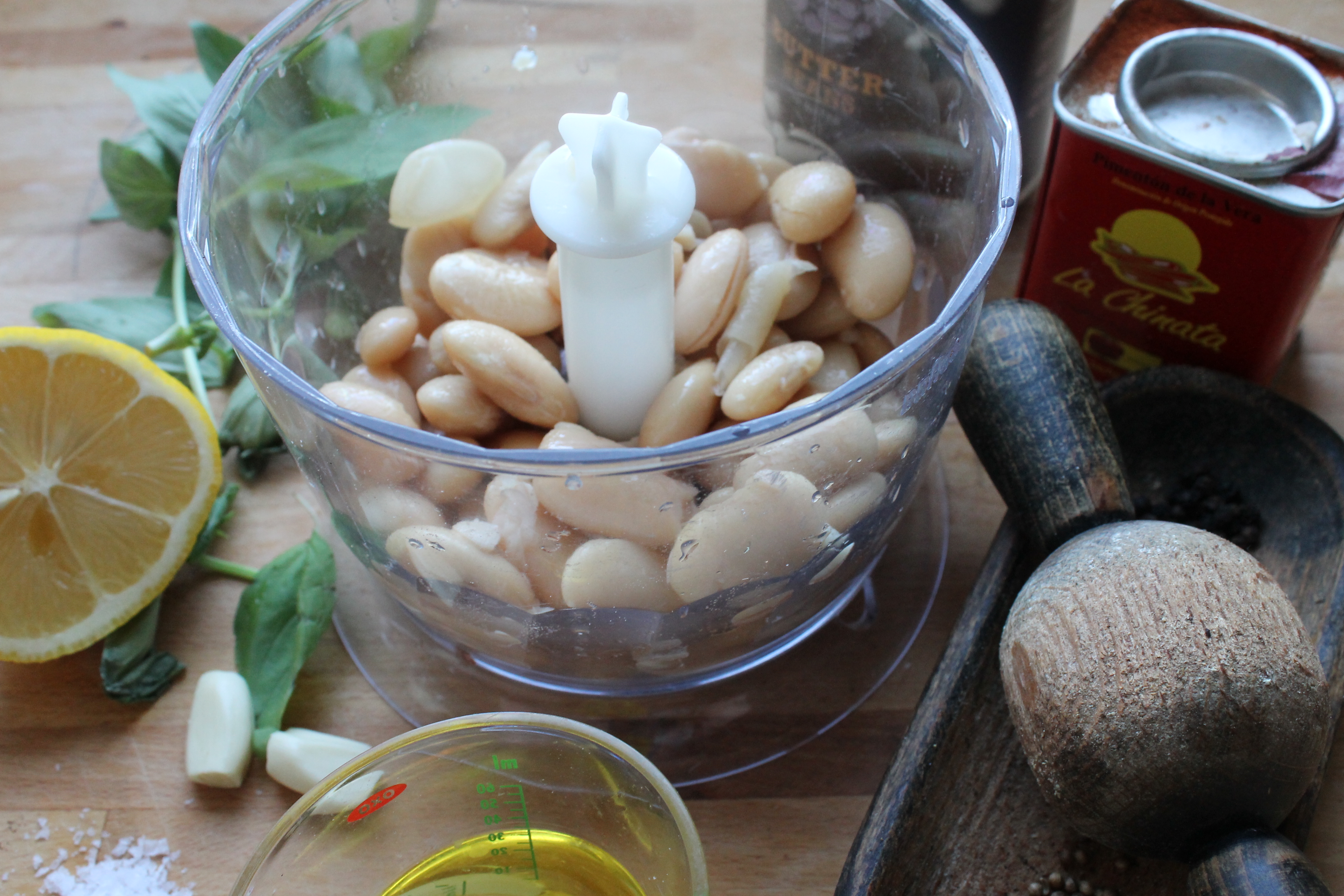 Mig langaði í ídýfu með brauðinu – ekki hummus en eitthvað svipað. Ég opnaði dós af smjörbaunum sem ég átti í jarðskjálftabirgðunum og hellti vökvanum af þeim. Setti þær svo í litlu skálina sem fylgir með töfrasprotanum og tíndi til hvítlauk, basilíku, salt, pipar, kóríanderfræ, 3 msk af ólífuolíu, hálfa sítrónu og reykta papriku (má vera venjuleg).