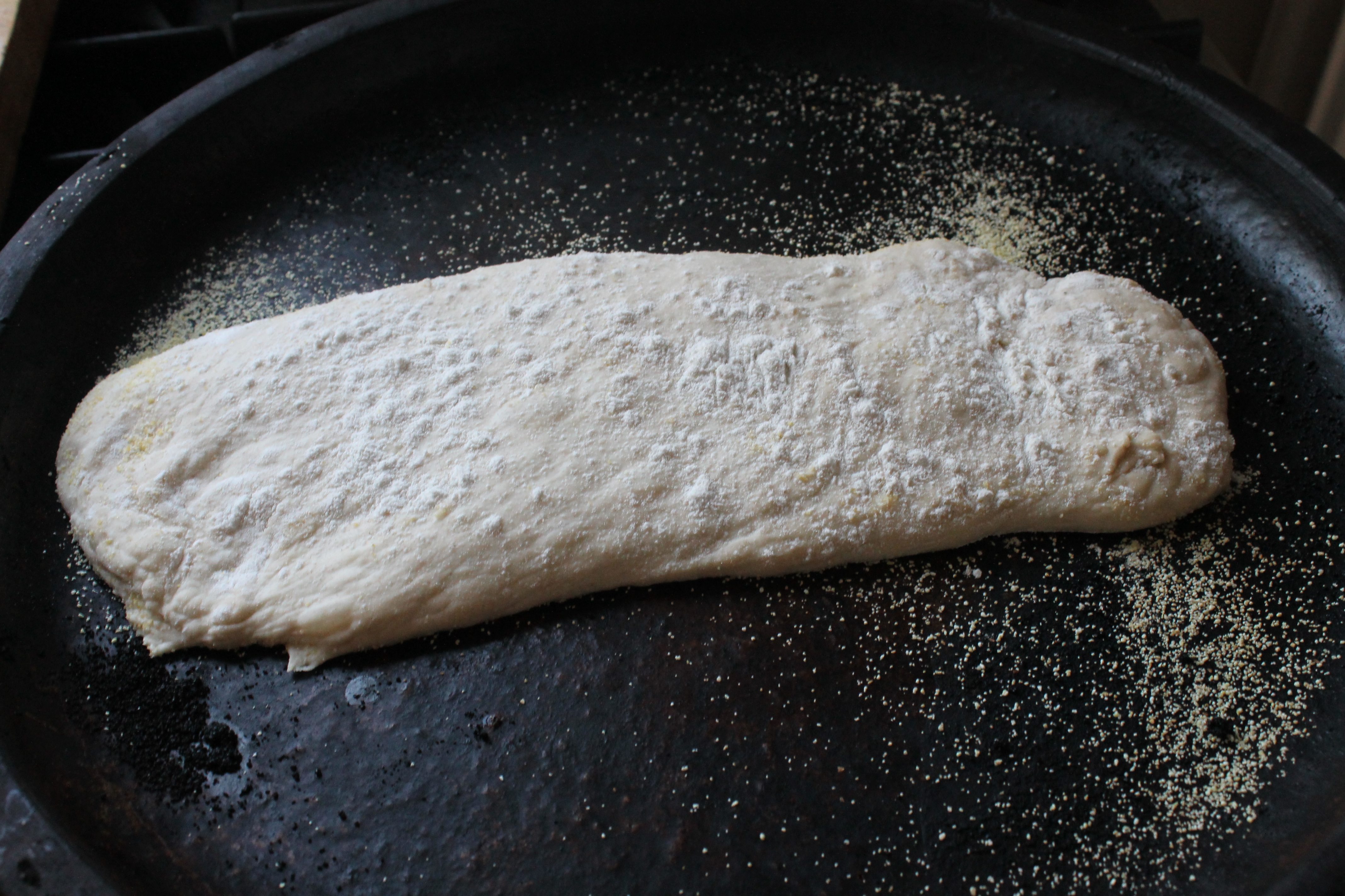 Teygði hann og togaði og lagði á pítsuspaðann minn, sem ég var búin að strá maísmjöli á. – Það er ekkert alveg einfalt að meðhöndla svona blautt deig og í rauninni er það eitthvað sem maður lærir bara á smátt og smátt. Um að gera að dýfa höndunum í hveiti til skiptis á meðan og vera bara frekar fljótur. Og svo gerir ekkert til þótt brauðið sé ekki sérlega fallegt í laginu …