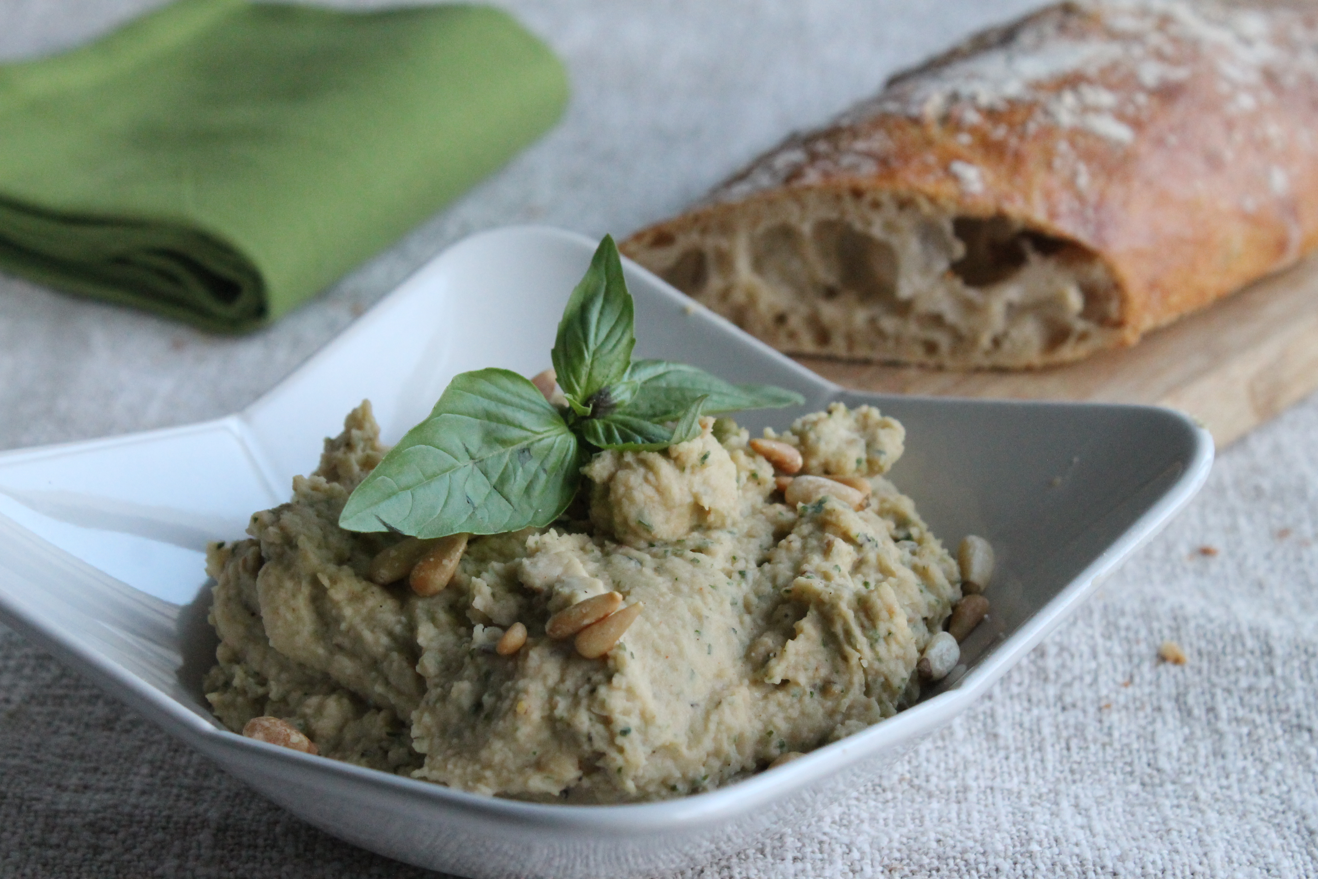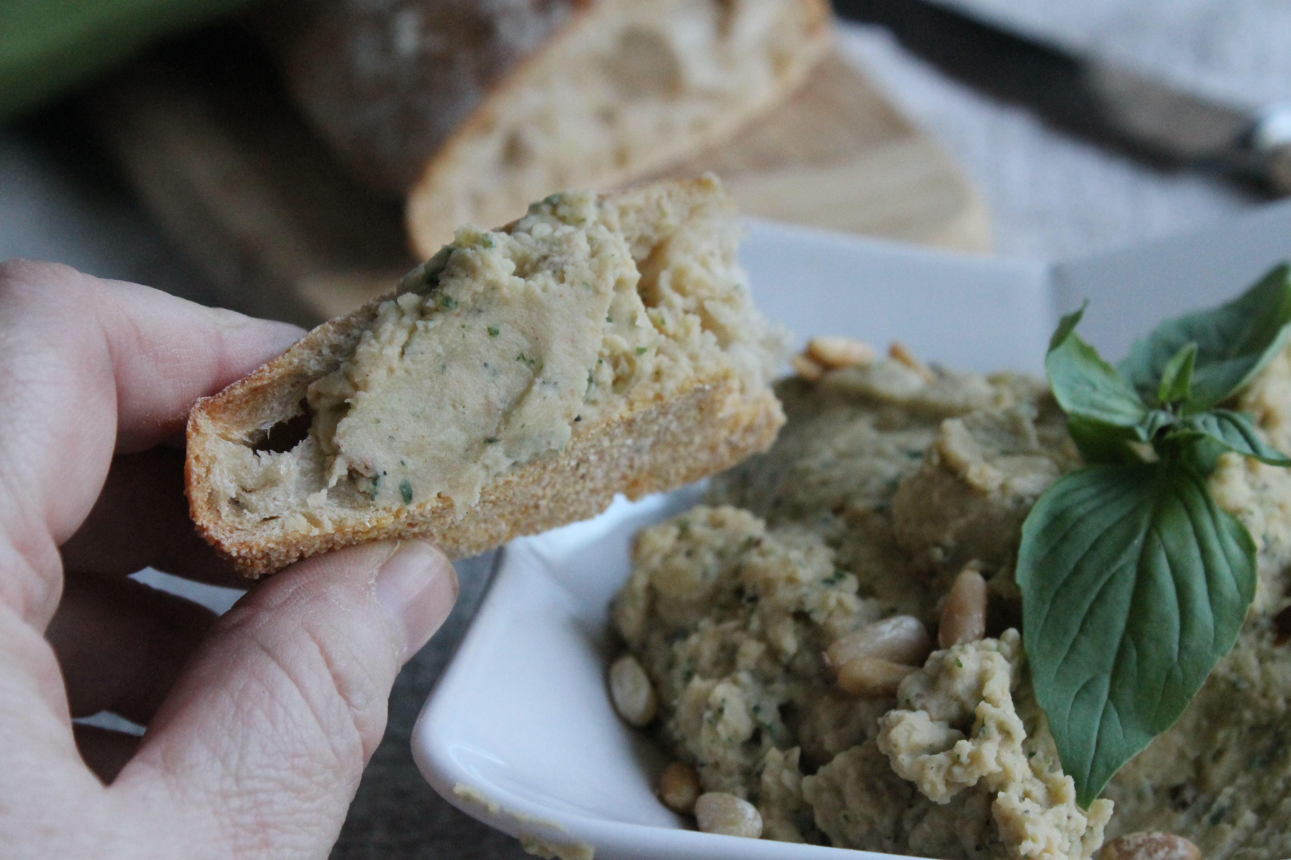 Ég maukaði baunirnar, hvítlaukinn og basilíkuna gróft, hellti olíunni saman við og kryddaði með steyttu kóríanderfræi, nýmöluðum pipar og salti og maukaði þetta fínt.