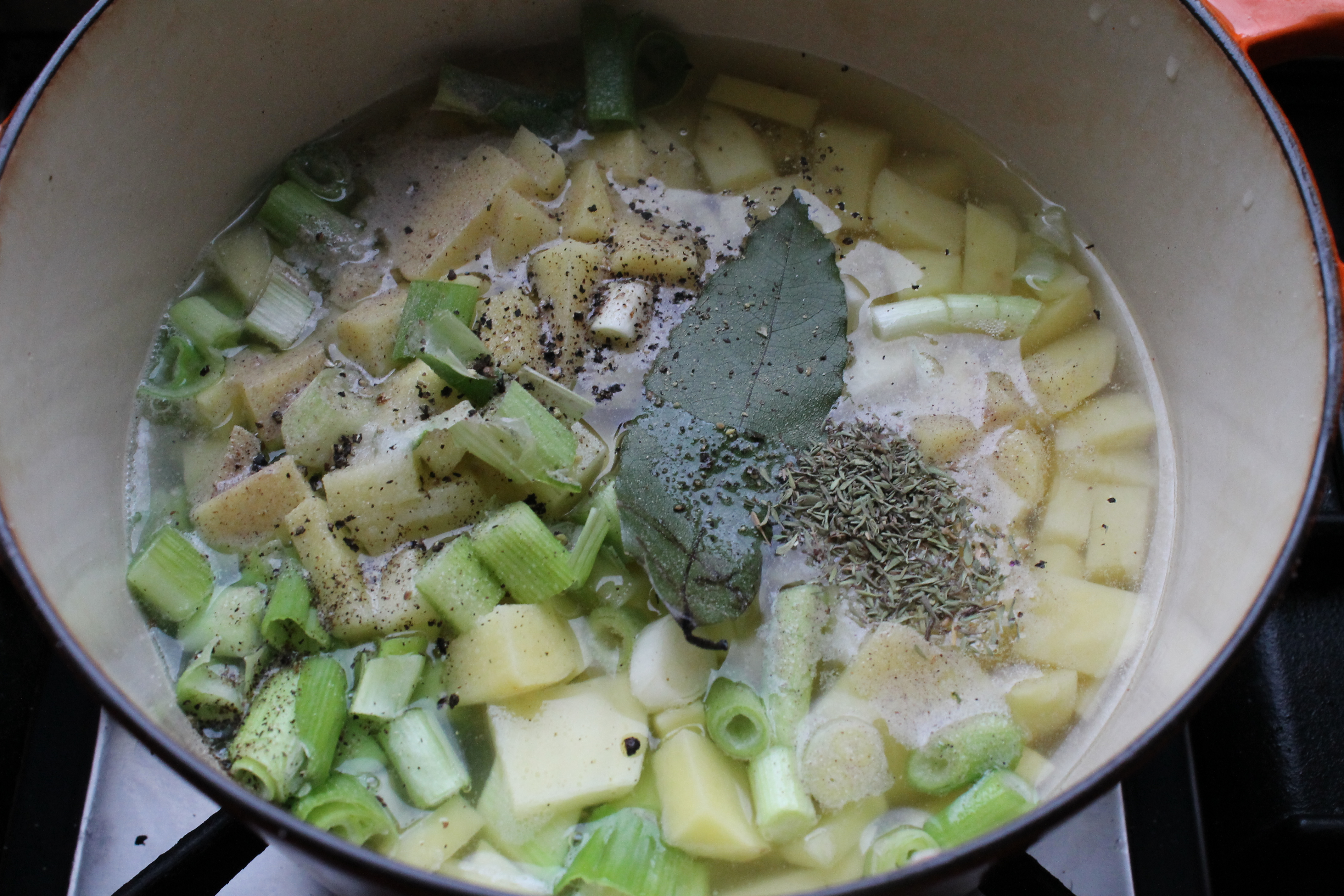 Ég tók tvær bökunarkartöflur, flysjaði þær og skar þær í frekar litla bita. Ég notaði grænu blöðin af nokkrum vorlaukum í annað í gær og ákvað að nota hvítu og ljósgrænu blaðhlutana í súpuna en annars hefði ég kannski bara notað blaðlauk. Svo tók ég reyndar tvo heila vorlauka, geymdi grænu blöðin en skar hitt niður.