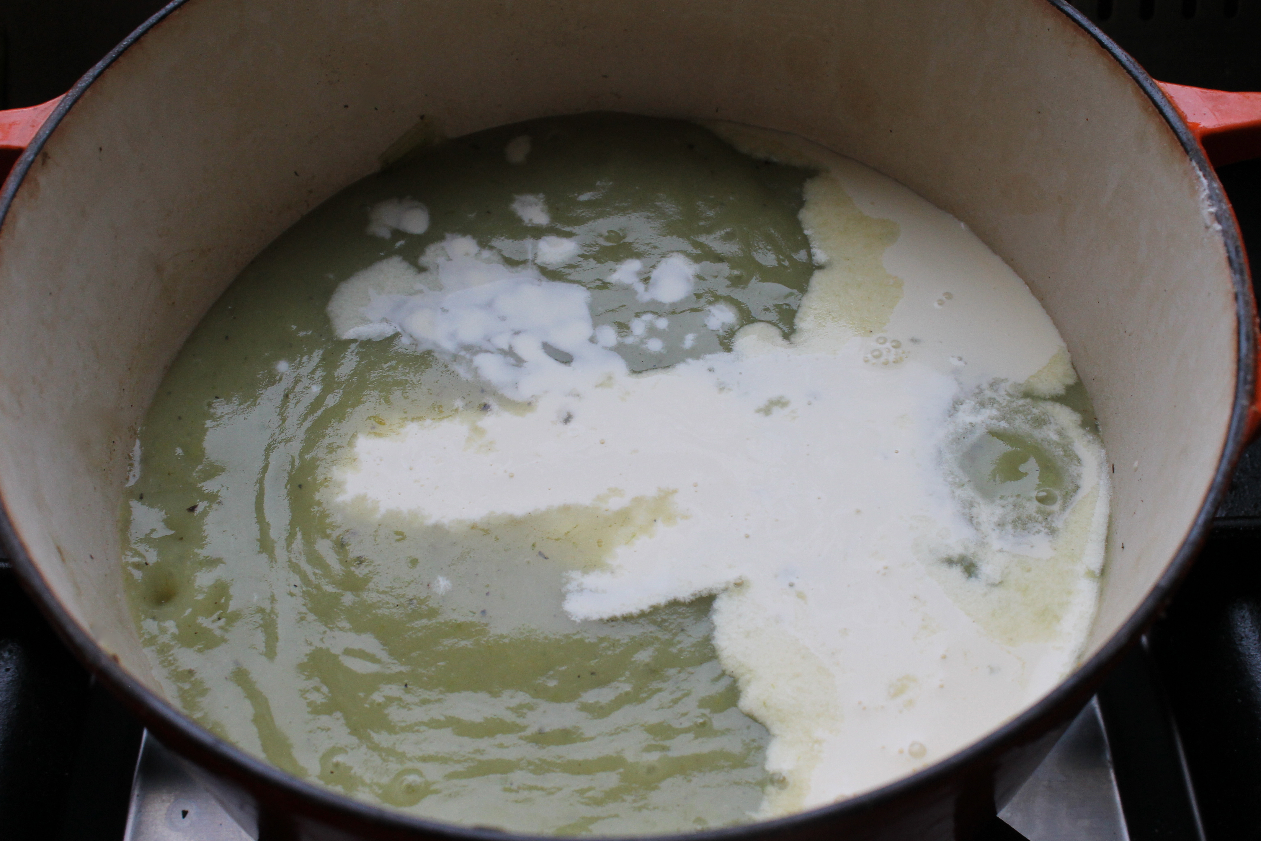 Þegar kartöflurnar voru orðnar meyrar slökkti ég undir pottinum og lét súpuna kólna í nokkrar mínútur en þá hellti ég henni í matvinnsluvélina og maukaði hana fínt. Svo hellti ég henni aftur í pottinn.