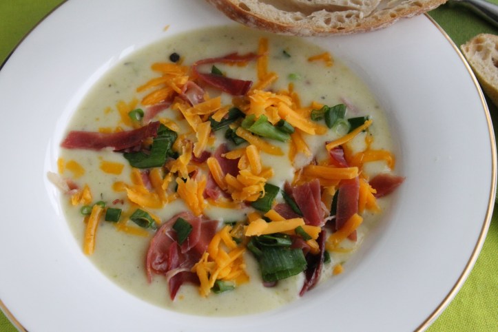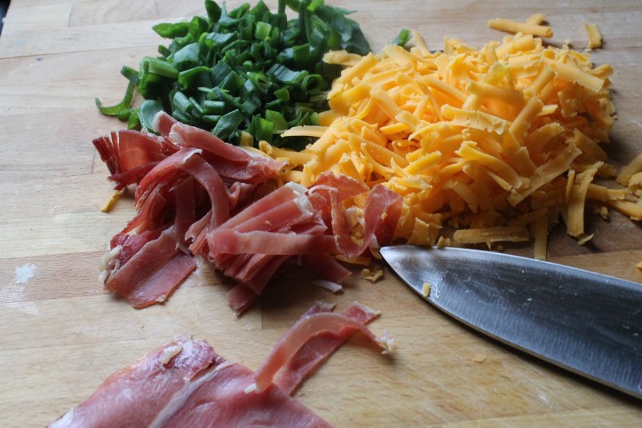 Á meðan súpan mallaði útbjó ég útálátið: Ég saxaði græna vorlaukinn sem eftir var, reif gróft niður svona 50 g af cheddarosti (það má alveg vera annar ostur en cheddarosturinn er bæði bragðmikill og hefur rétta litinn) og skar niður þrjár sneiðar af Serranoskinku. Það má auðvitað vera önnur hráskinka. Það mætti líka vera beikon sem þarf þá að steikja fyrst en mér fannst að beikonbragðið yrði of frekt í þessari súpu svo ég valdi hráskinkuna frekar.