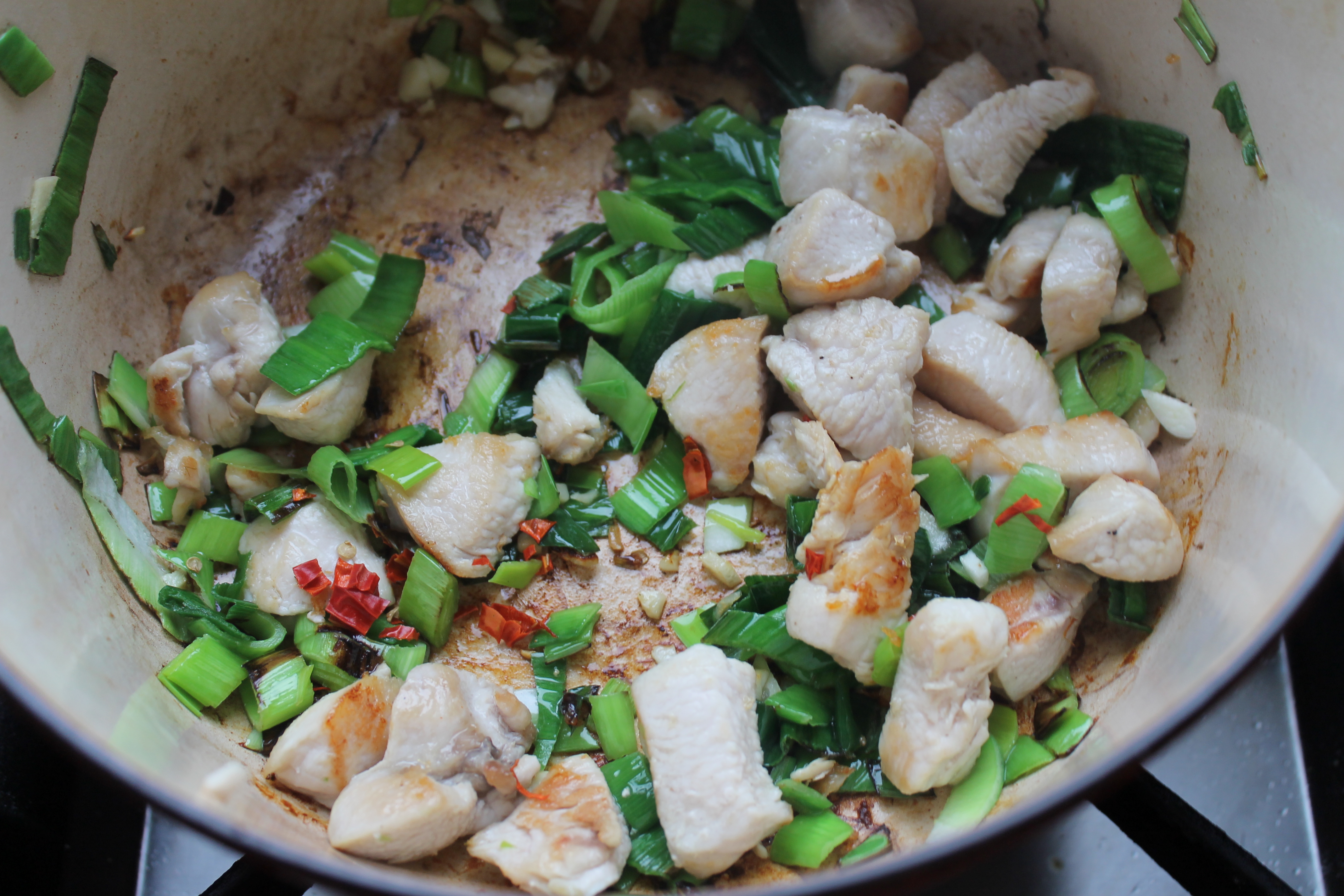 Ég byrjaði á því að skera eina kjúklingabringu niður í munnbitastærð. Svo hitaði ég eina matskeið af olíu í þykkbotna potti og snöggbrúnaði kjúklingabitana við góðan hita.