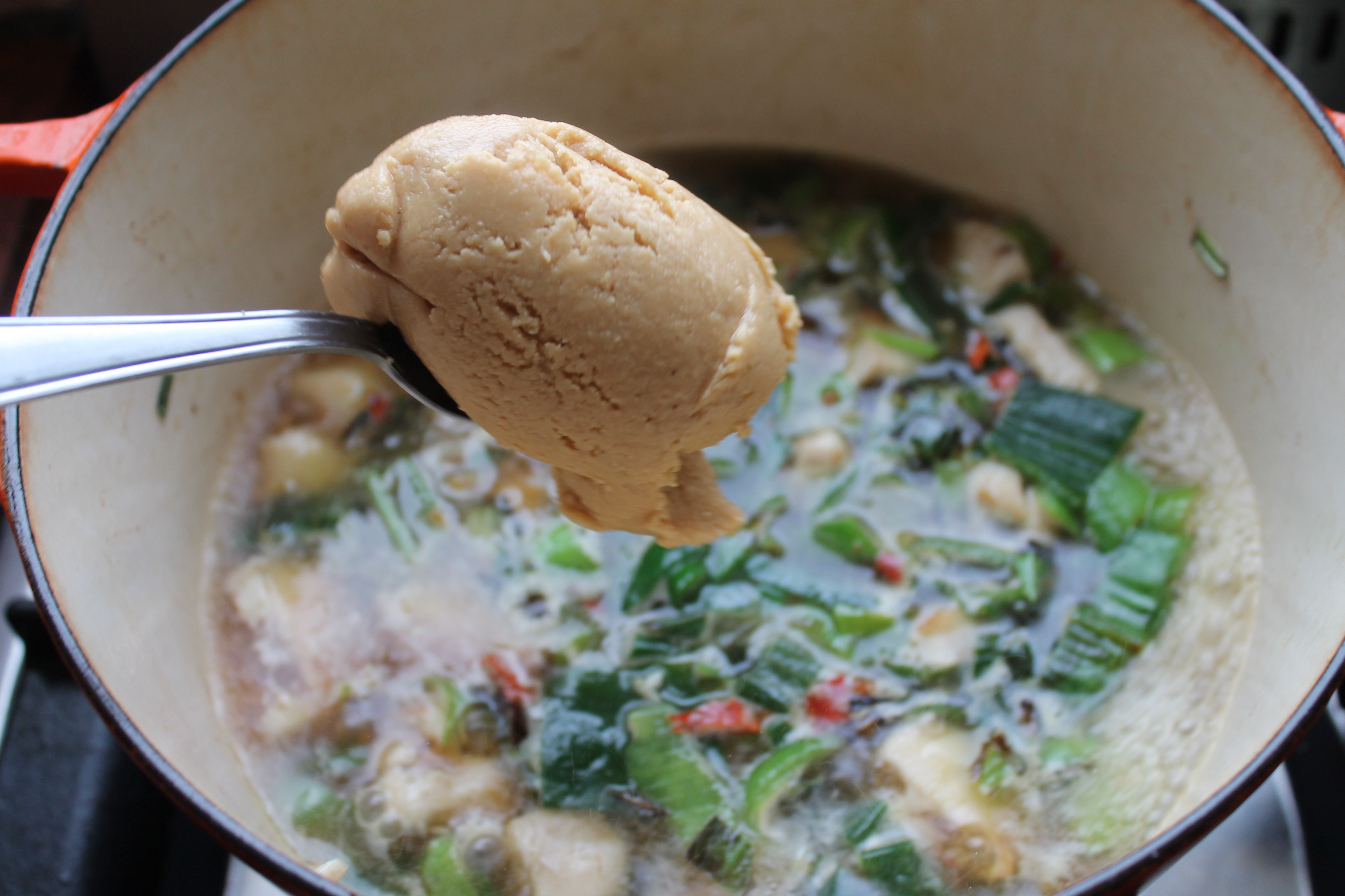 Svo tók ég svona 15 cm bút af blaðlauk (grænu blöðin) og saxaði þau. Saxaði tvo hvítlauksgeira og hálft rautt chilialdin smátt, setti þetta allt í pottinn og lét krauma í 2-3 mínútur en hellti þá 1/2 l af vatni út í og bætti við svona teskeið af grænmetiskrafti, einni og hálfri teskeið af sojasósu og ögn af pipar.