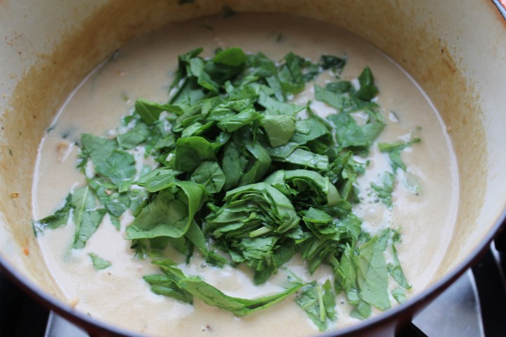 Ég átti til lúkufylli af spínati og endaði á að saxa það niður og henda út í, þegar svona mínúta var eftir af suðutímanum.