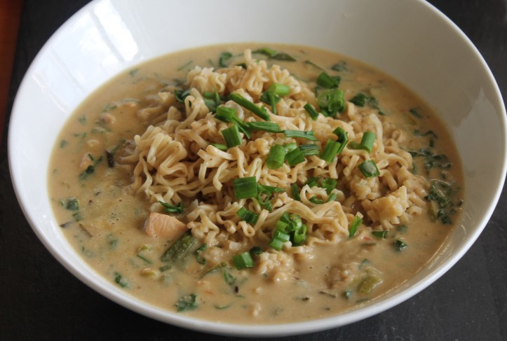 Ég borðaði núðlurnar og kjúklinginn með prjónum. Núðlurnar sugu í sig svo mikið af súpunni/sósunni að það var ekki mikið eftir í skálinni til að borða með skeið … Þetta var alveg ágætt. Hvort sem það var nú súpa eða eitthvað annað.