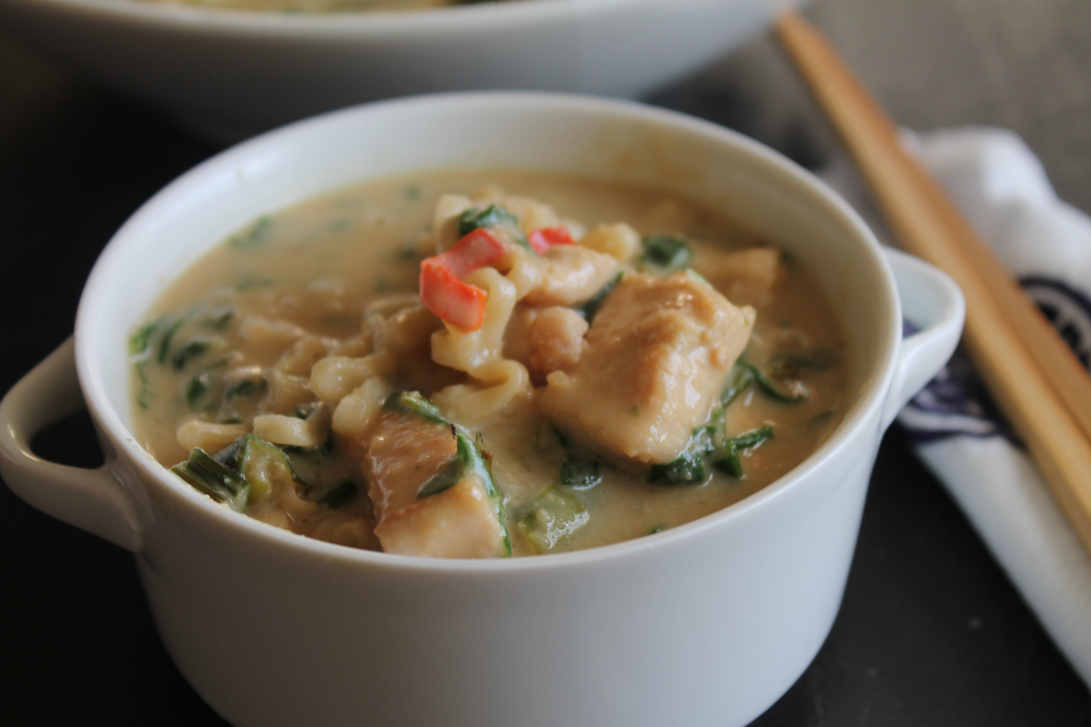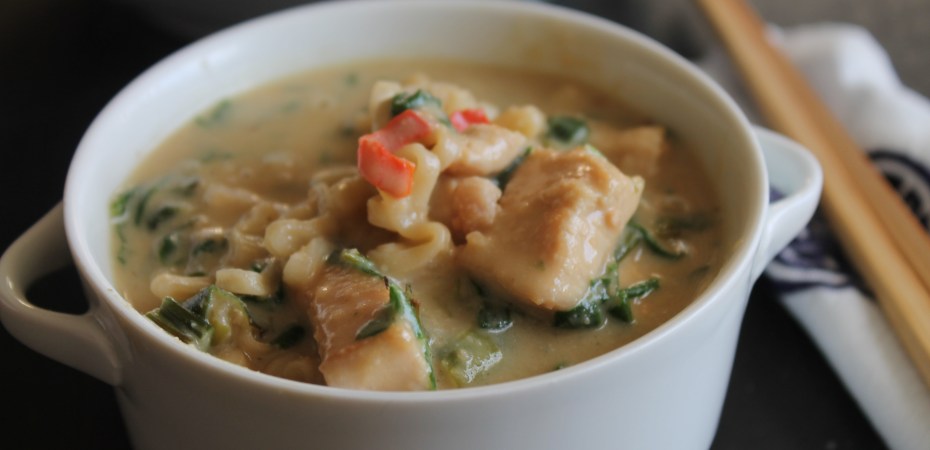 Um leið og ég setti núðlurnar (eggjanúðlur, sirka 80 grömm) í pottinn (suðutími 4 mínútur) hellti ég svo úr lítilli dós af kókosmjólk út í súpupottinn og lét malla á meðan núðlurnar suðu. Smakkaði súpuna og bætti við ögn af pipar.