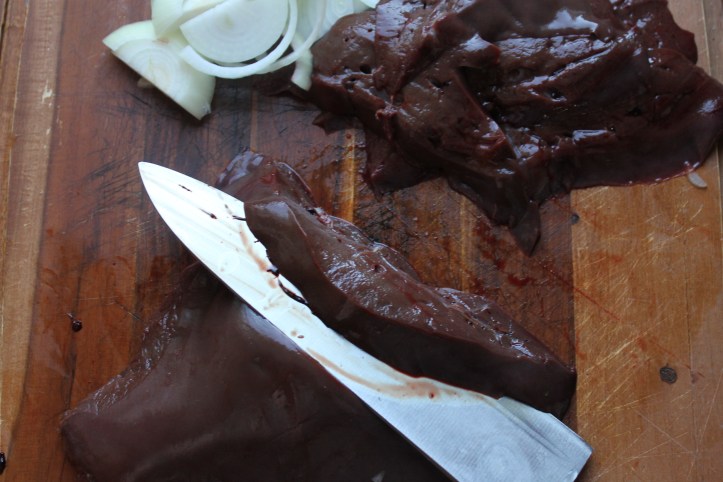 Ég byrjaði á að flysja lauk (átti bara einn en hefði helst viljað hafa tvo), skera hann í tvennt og skera svo hvorn helming um sig í þunnar sneiðar. Svo þerraði ég lifrina með eldhúspappír, skar burt himnur og æðar og skar hana svo á ská í sneiðar, 1 cm eða þynnri.