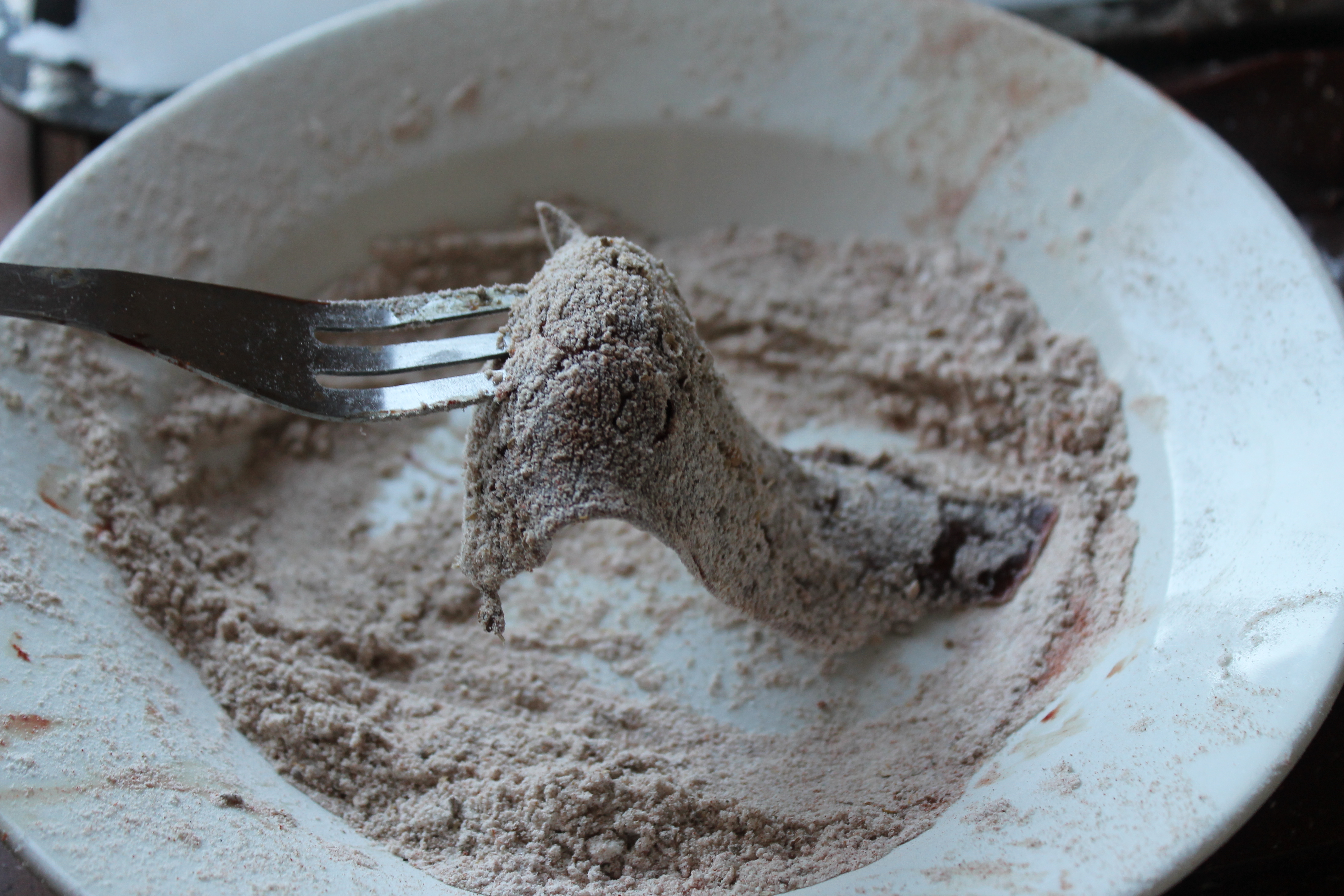 Á meðan blandaði ég saman 3 msk af hveiti, 1 tsk af kummini, 1 tsk af steyttu kóríanderfræi, 3/4 tsk af reyktri papriku (má vera venjuleg), cayenne-pipar á hnífsoddi og dálitlum pipar og salti.