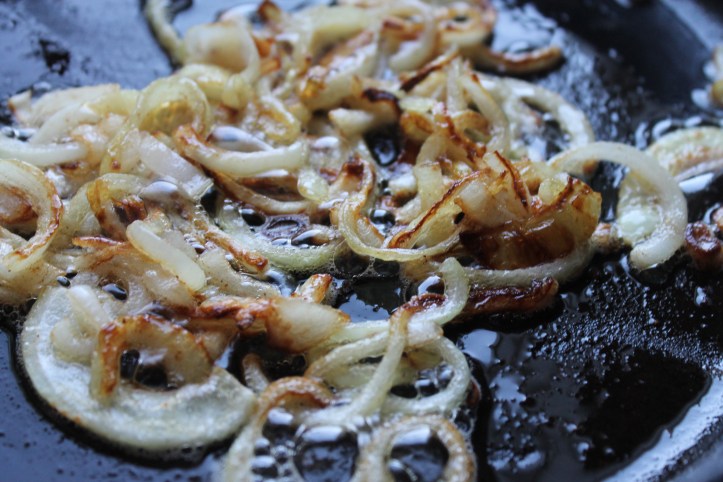 Ég hitaði 1 msk af olíu og 1 msk af smjöri á þykkbotna pönnu, setti laukinn á hana og lét hann krauma við vægan hita í 10-15 mínútur. Hrærði oft á meðan og passaði að hann brynni ekki.