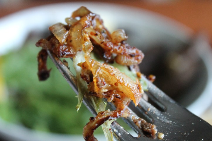 Svo bar ég þær fram á salati með sítrónubátum og dreifði lauknum yfir.